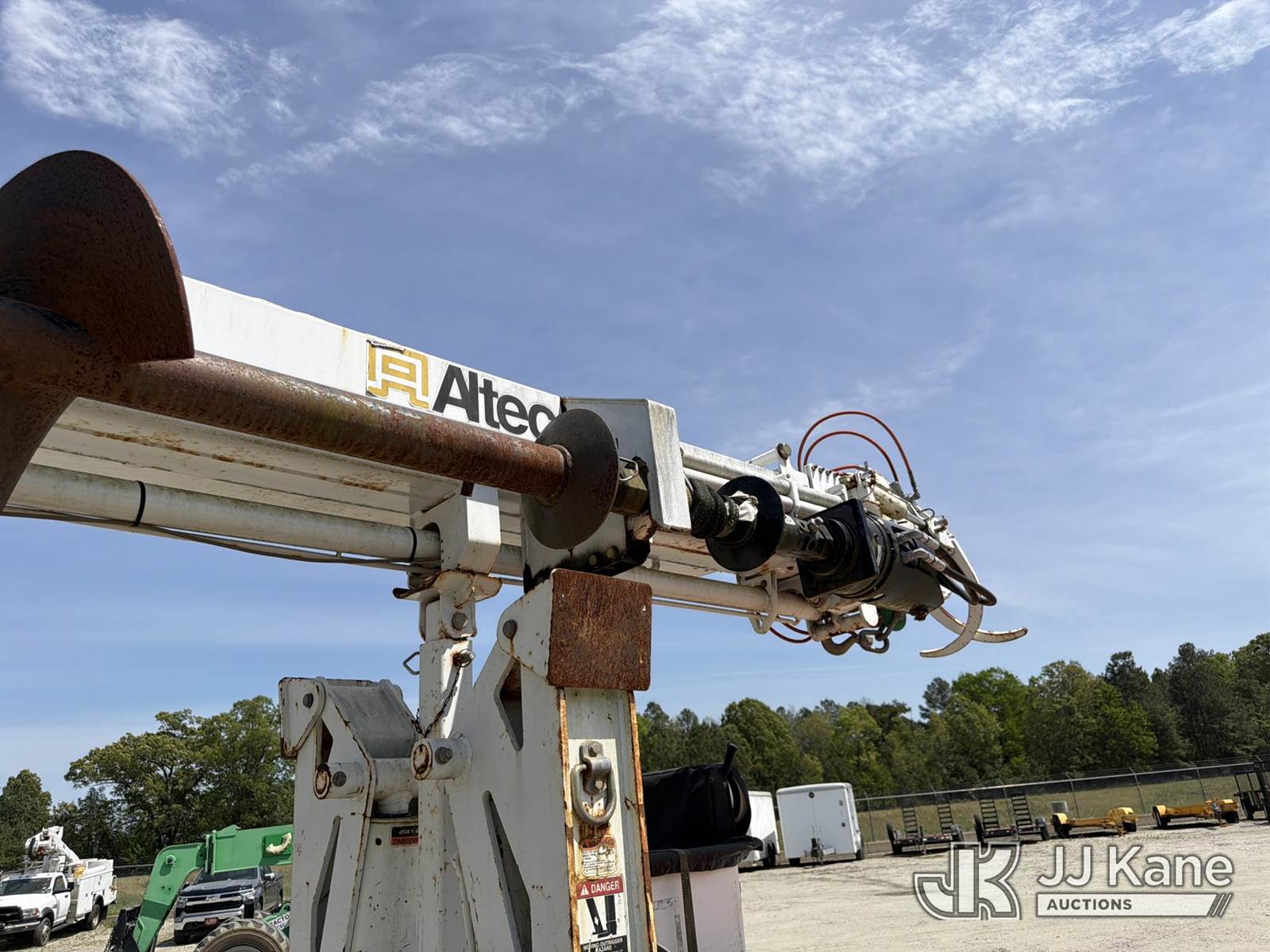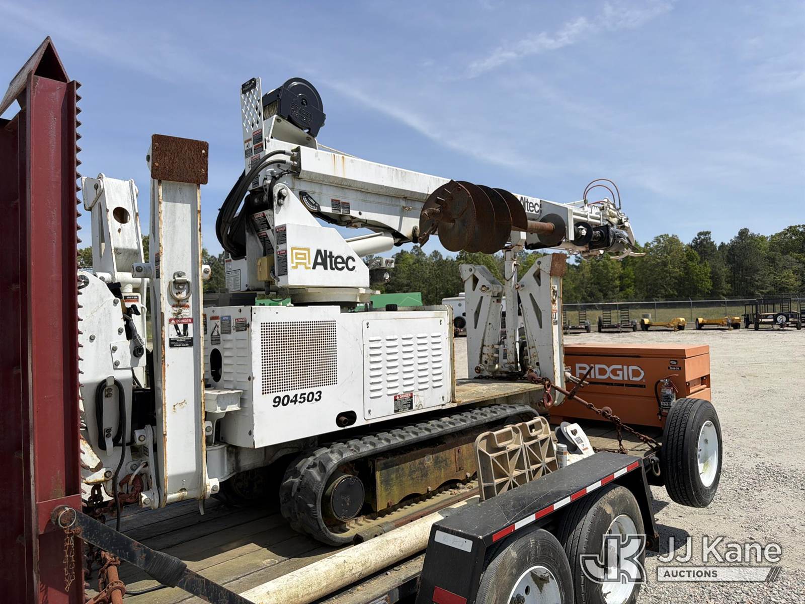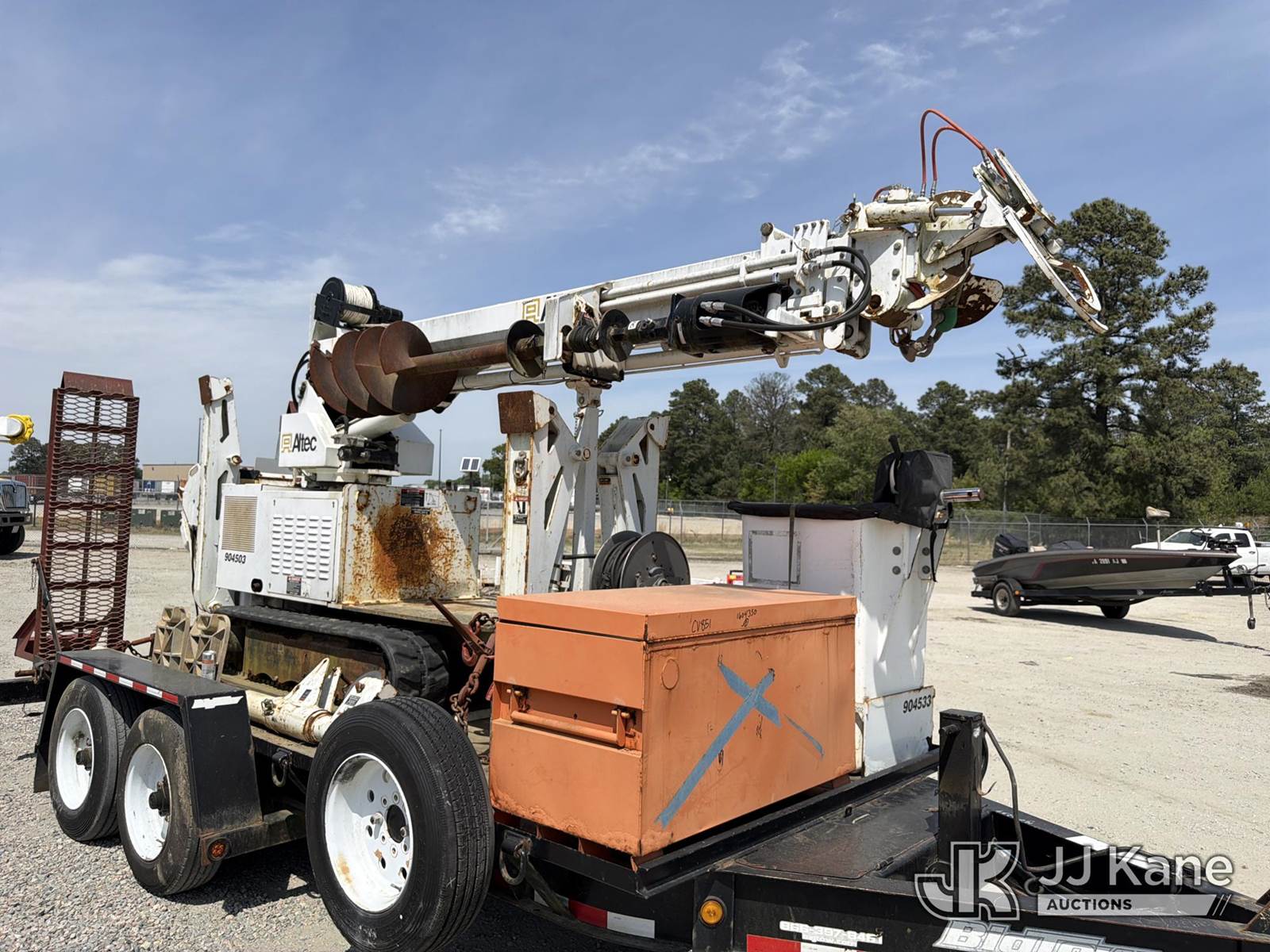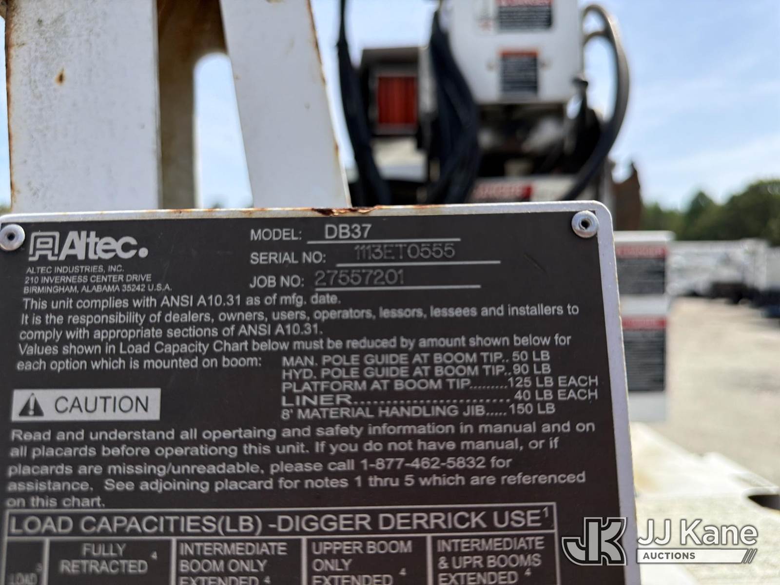 Altec DB37, 3,800 Lb Back Yard Digger Derrick s/n 1113ET0555, with 37 ft sheave height, pin-on bucket, remote, heel winch, pole grabs & support trailer Vin: 4KNUT1620EL161016, mounted on McElroy Crawler Back Yard Carrier, s/n 059860, Selling With ID 1604239.(Equipment & Trailer Price Will Be Split Out On Invoice To Reflect 80/20, Equipment To Trailer Price Ratio For Tax Purposes.) (Cranks, Not Running, Condition Unknown) (Reads 800 hours) NOTE: This unit is being sold AS IS/WHERE IS via Timed Auction and is located in Chester, VA. Inspection & preview days for this unit are the 2 business days prior to the first day of items closing for this auction, item is located at 13301 Great Coastal Dr Chester, VA 23836 and hours of operations are 7am-3pm. For pre-sale questions, please contact Doug Caton @ 804-807-4574. (Missing manuals, See Auction Company for Manufacturers Information to obtain manuals) (Buyer is responsible for removal. Assistance by consignor or JJ Kane Auctions is not assured.)