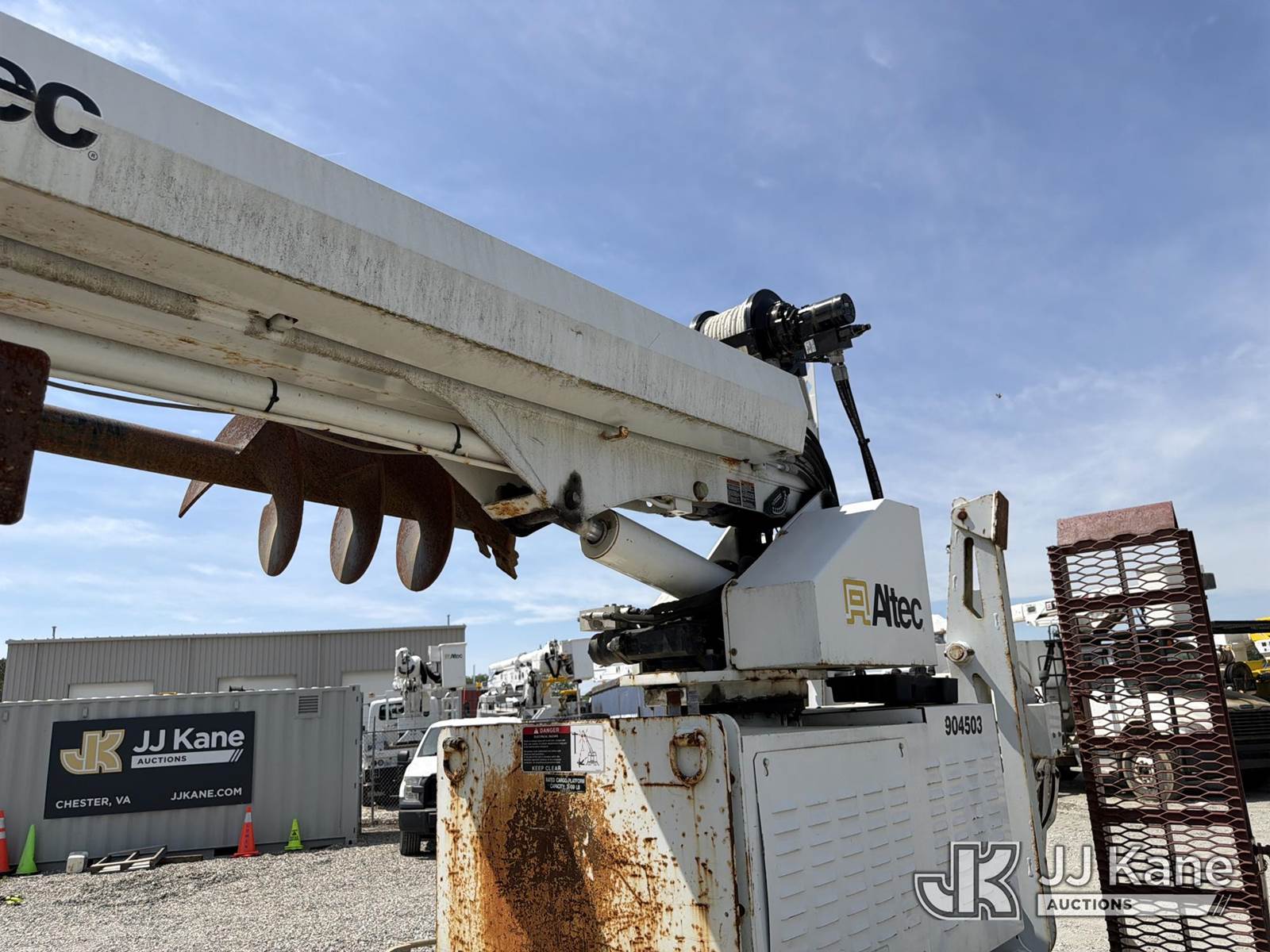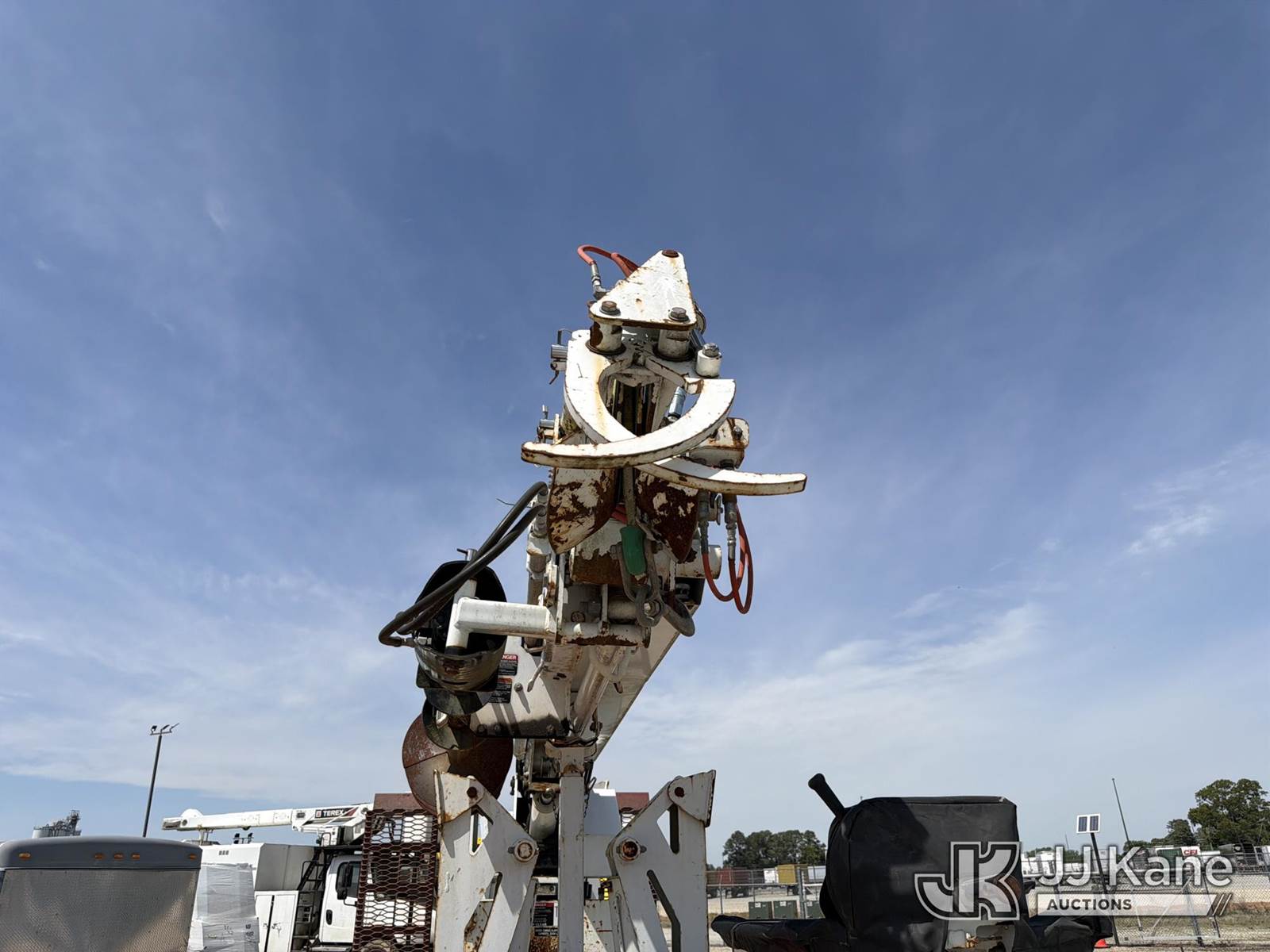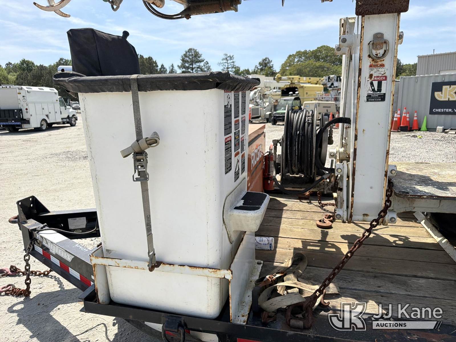 Altec DB37, 3,800 Lb Back Yard Digger Derrick s/n 1113ET0555, with 37 ft sheave height, pin-on bucket, remote, heel winch, pole grabs & support trailer Vin: 4KNUT1620EL161016, mounted on McElroy Crawler Back Yard Carrier, s/n 059860, Selling With ID 1604239.(Equipment & Trailer Price Will Be Split Out On Invoice To Reflect 80/20, Equipment To Trailer Price Ratio For Tax Purposes.) (Cranks, Not Running, Condition Unknown) (Reads 800 hours) NOTE: This unit is being sold AS IS/WHERE IS via Timed Auction and is located in Chester, VA. Inspection & preview days for this unit are the 2 business days prior to the first day of items closing for this auction, item is located at 13301 Great Coastal Dr Chester, VA 23836 and hours of operations are 7am-3pm. For pre-sale questions, please contact Doug Caton @ 804-807-4574. (Missing manuals, See Auction Company for Manufacturers Information to obtain manuals) (Buyer is responsible for removal. Assistance by consignor or JJ Kane Auctions is not assured.)