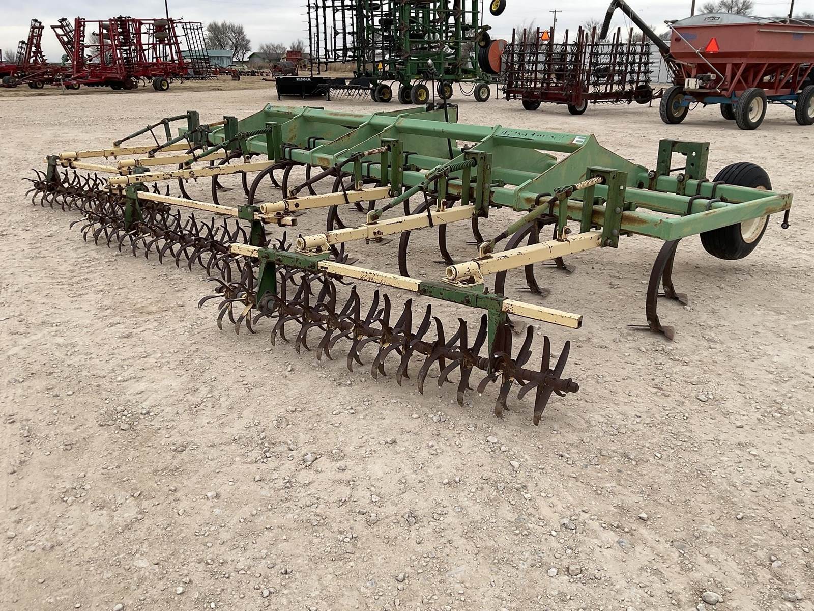 Bigham brothers 20’ chisel plow. Has gauge wheels up front and Roll-A-Cone treaders on the back. Sweeps and shanks look to be in good shape. 1 shank on the back is a little bent, see pictures. Nice chisel plow!