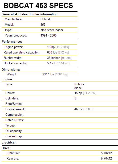 Bobcat 453 skid steer, featuring a 15 horsepower diesel, a 600 lb Rated Operating Capacity, and an operating weight near 2500 lbs, powered by a liquid-cooled diesel engine, hand and foot controls, Bob-Tach system, and standard-flow hydraulic options for versatility with various attachments like buckets, forks, and trenchers.