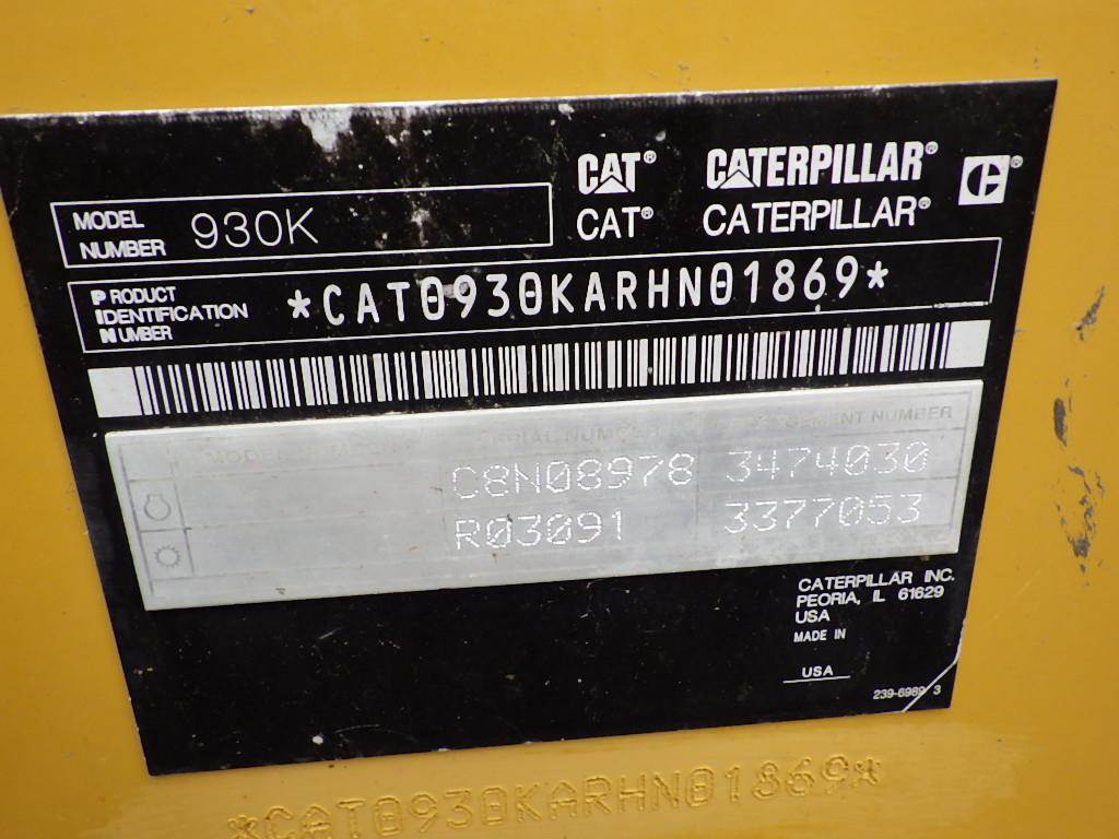 S/N: CAT0930KARHN01869 6-Cyl Turbo Diesel, EROPS, Auxiliary Hydraulics, Hydraulic Quick Coupler, 108" Bucket w/ Teeth, CB, Ride Control, A/C/Heat, AM/FM/CD, Heater Mirrors, Work Lights, 20.5R25 Tires, Meter Reading: 6,380 Disclaimer: Hours and mileage are visually observed and not verified.