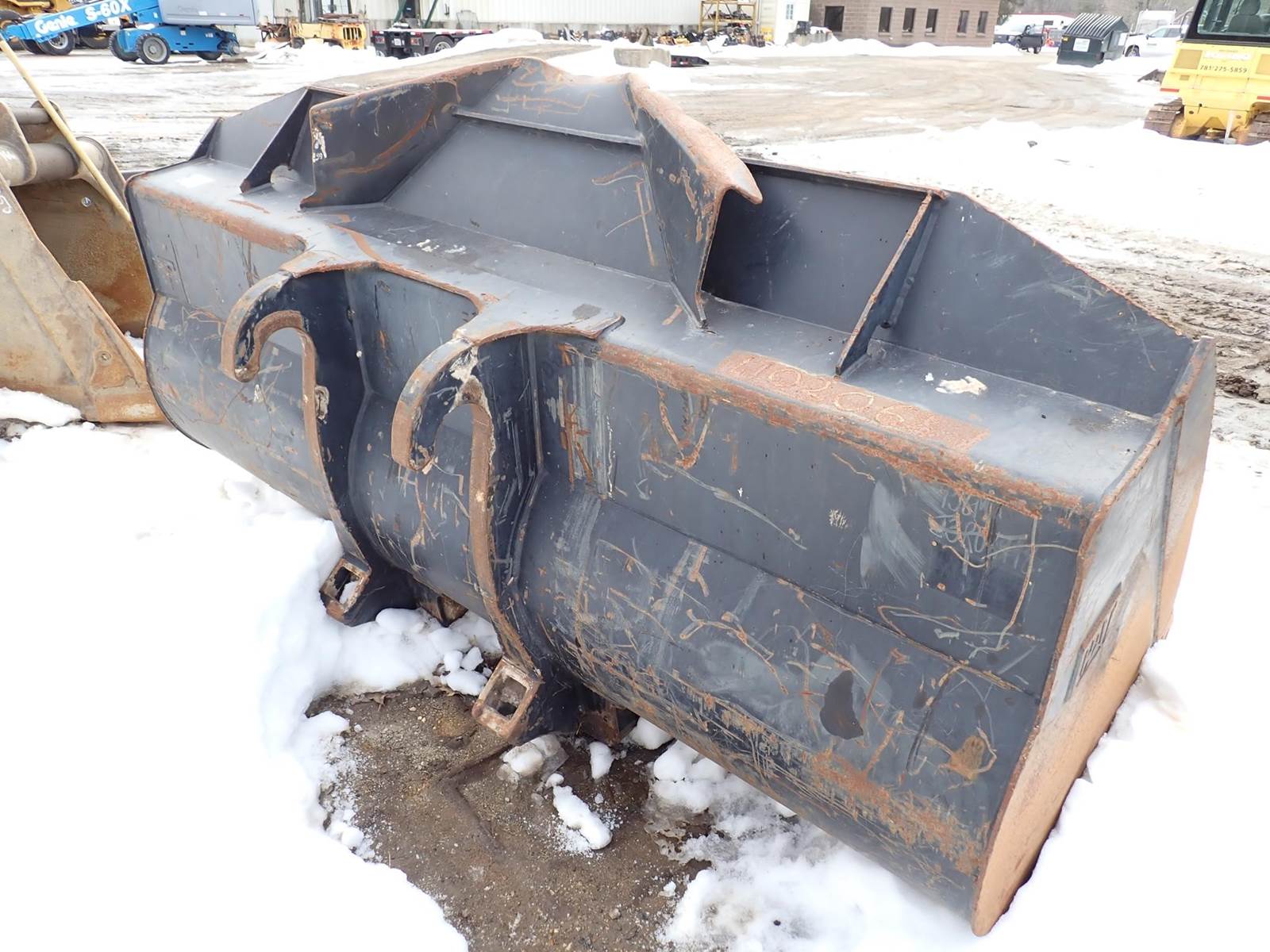 9 ft wide loader bucket for Cat loader w/ fusion coupler, 21 1/4" spread between hooks, 29" from pin to hook