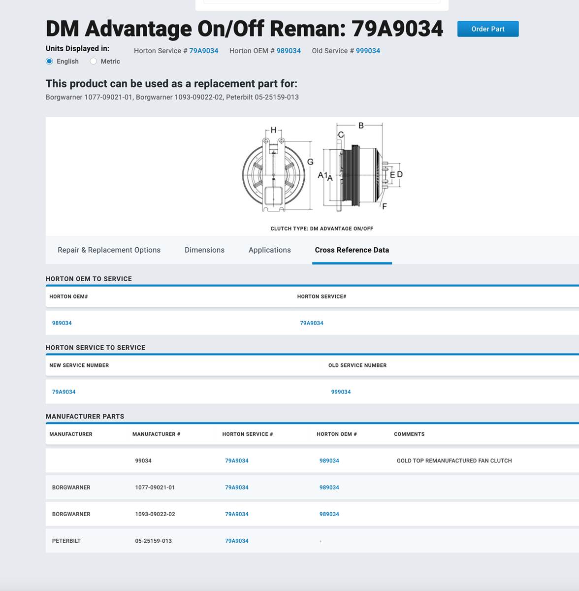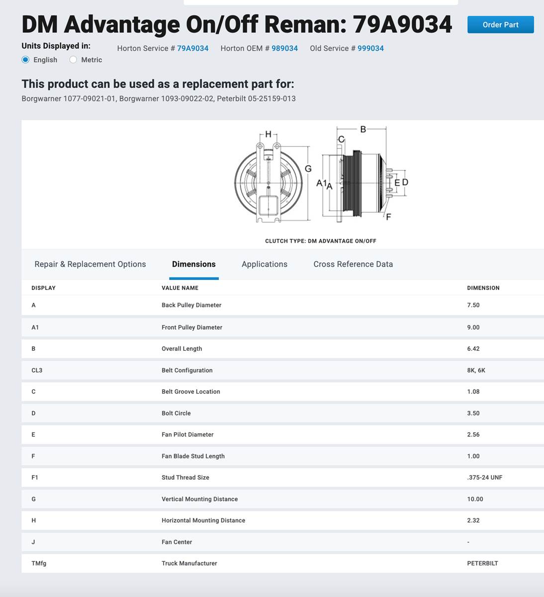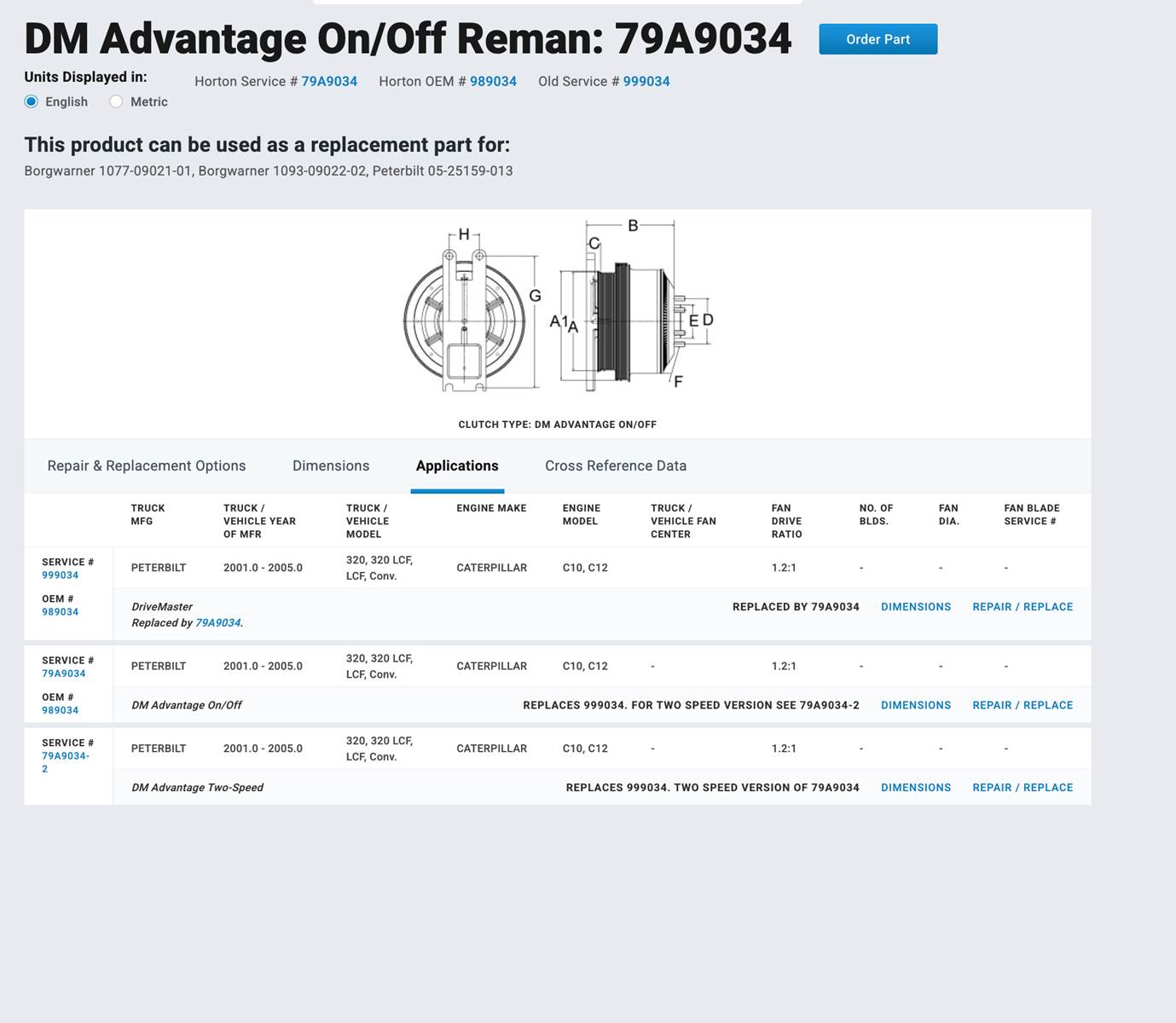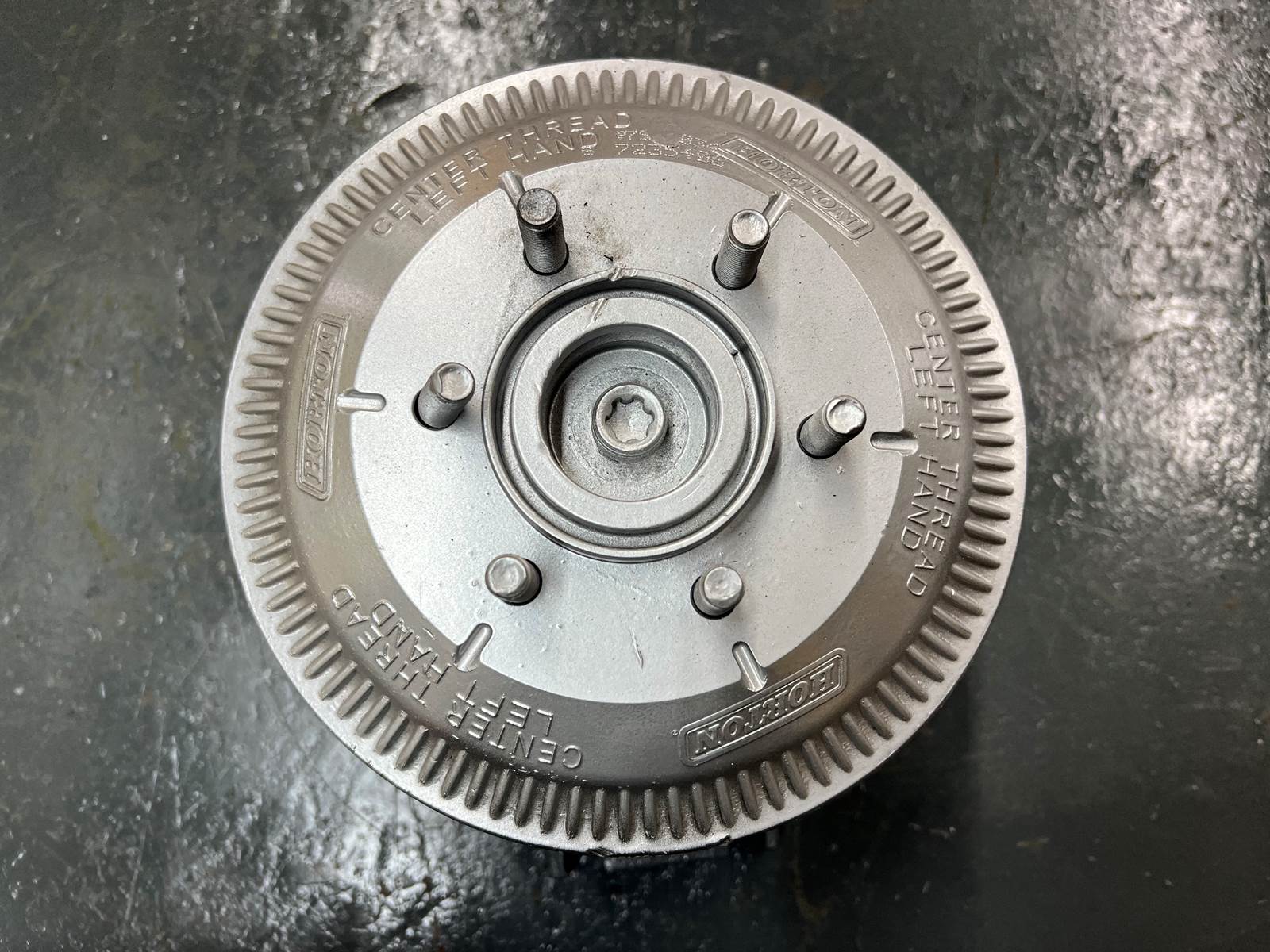 (GOOD USED) Horton Advantage On/Off Fan Clutch 79A9034 For Sale, Horton Service # 79A9034, Horton OEM # 989034, Old Service # 999034, Peterbilt Part # 05-25159-013, BorgWarner Part # 1077-09021-01, 1093-09022-02, Pulley Part # 601491, Fits 2001 - 2005 Peterbilt w/Caterpillar C10 / C12, Serial # 7235406, Stock # 10095