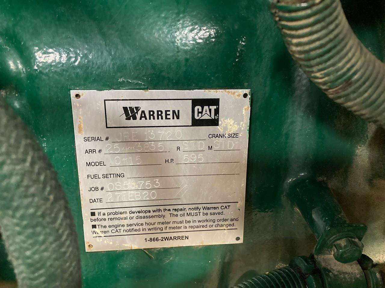 REBUILT CATERPILLAR C15 INDUSTRIAL DIESEL ENGINE FOR SALE at ADELMAN’S in CANTON, OHIO. 4.9 HOURS SHOWING ON ECM, ELECTRONIC, with 70 PIN ECM, 595 HP @ 2100 RPM, SERIAL # JRE13720, ARRANGEMENT # 254-3835, with 65+ LBS OIL PRESSURE. STARTER NOT INCLUDED.