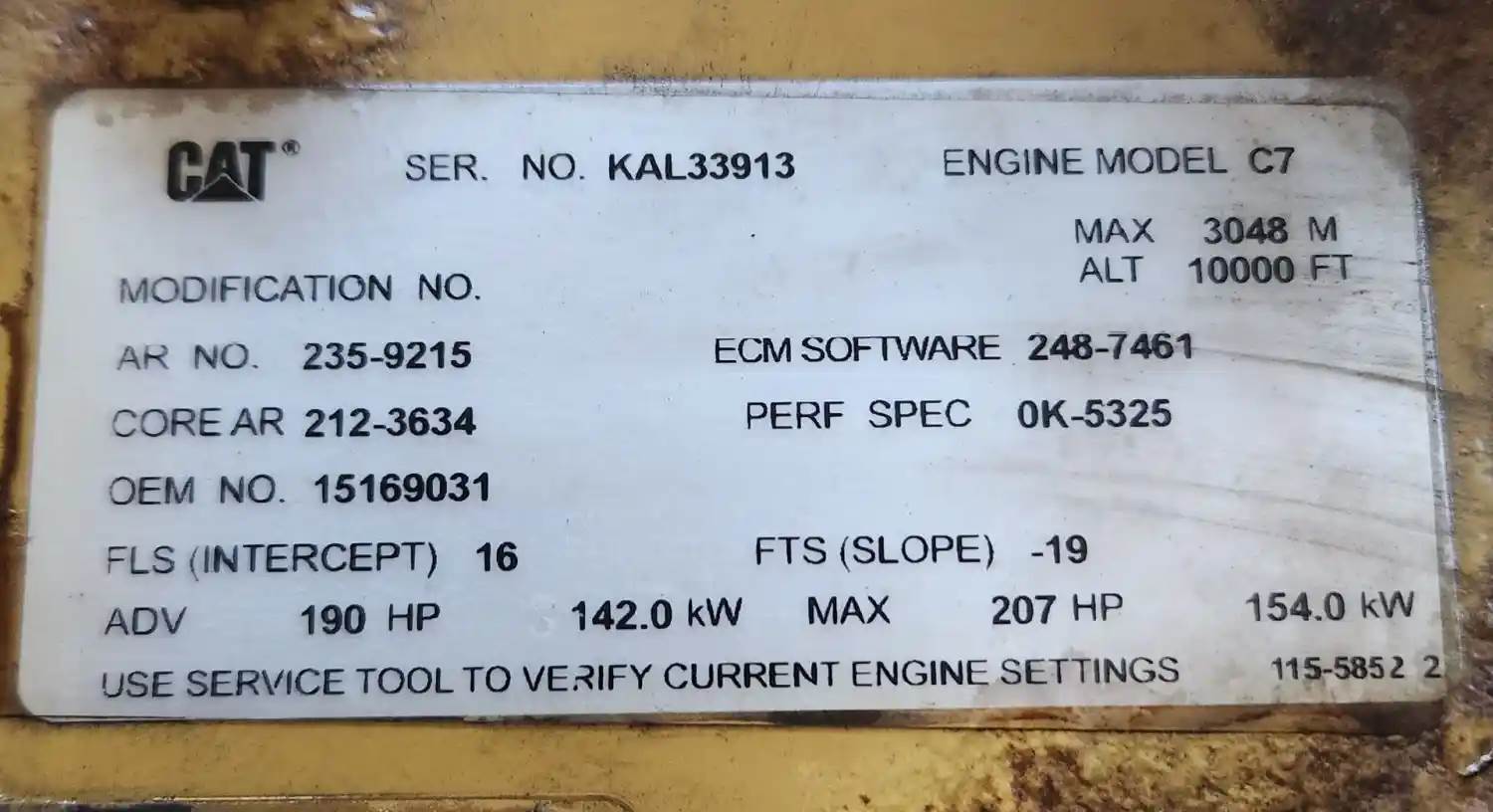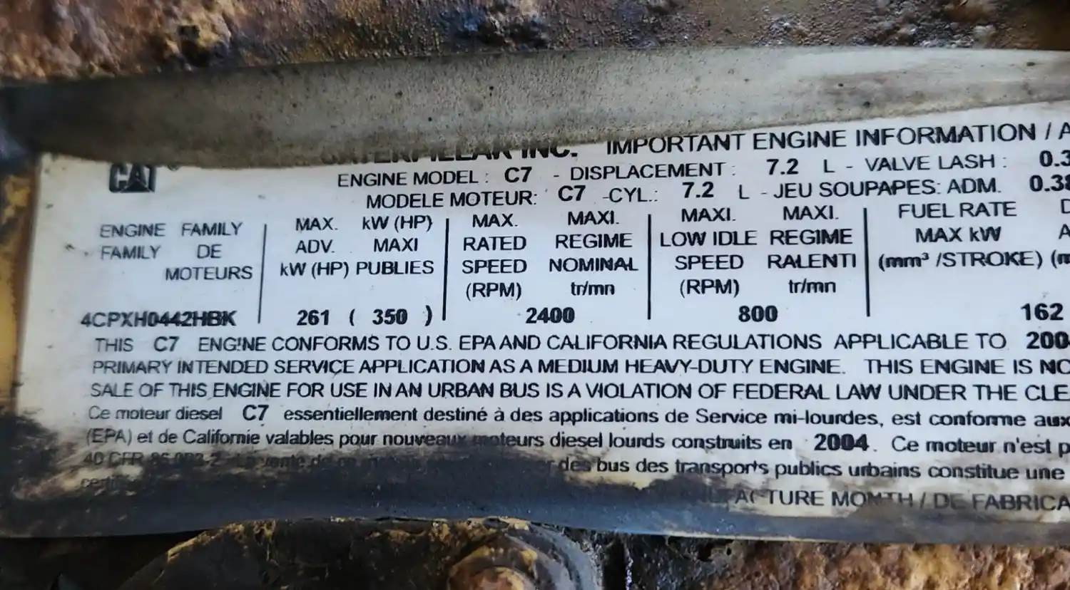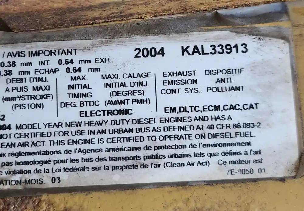 (Used) 2004 Caterpillar C7, ENGINE ASSEMBLY- Family Number: 4CPXH0442HBK, Displacement: 7.2L, Horsepower: 190, Ar.No.: 235-9215, Serial Number: KAL33913, Part Number: 15169031, E.C.S: EM, DI, TC, ECM, CAC, CAT, For more information about this item, give us a call. We ship Worldwide! (CRG HEAVY TRUCK PARTS) 929 W PULASKI HWY ELKTON, MD 21921, Serial#: KAL33913, Horse Power: 190, Casting#: KAL33913, ARR/CPL: 235-9215