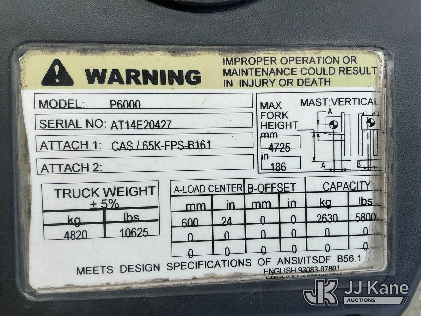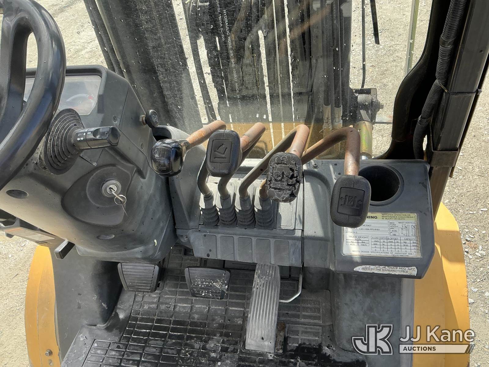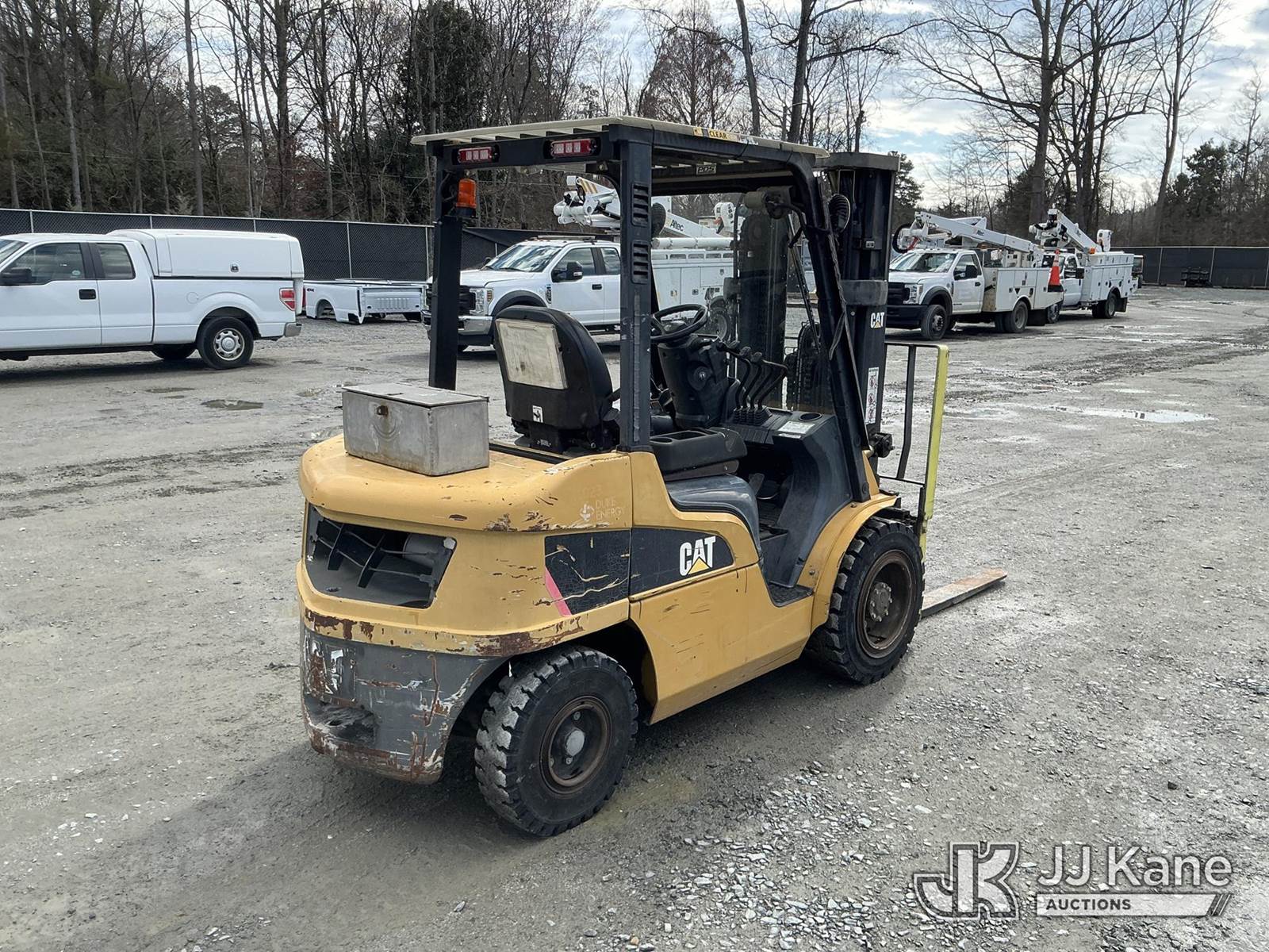 Caterpillar P6000 Solid Tired Forklift, s/n AT14E20427, 4-cyl, diesel, Shuttle, with 186in 3 stage mast, 48in forks, 5800lb lift capacity, hyd side shift, hyd in & out & ROPS, JJ Kane decommissioned (Duke Unit) (Runs, Moves & Operates ) (Reads 5,209 hours) NOTE: This unit is being sold AS IS/WHERE IS via Timed Auction and is located in China Grove, NC. Inspection & preview days for this unit are the 2 business days prior to the first day of items closing for this auction, item is located at 820 E NC Hwy 152 China Grove, NC 28023 and hours of operations are 8a-4p. For pre-sale questions, please contact Office Staff @ (704) 674-1113. (Buyer is responsible for removal. Assistance by consignor or JJ Kane Auctions is not assured.)