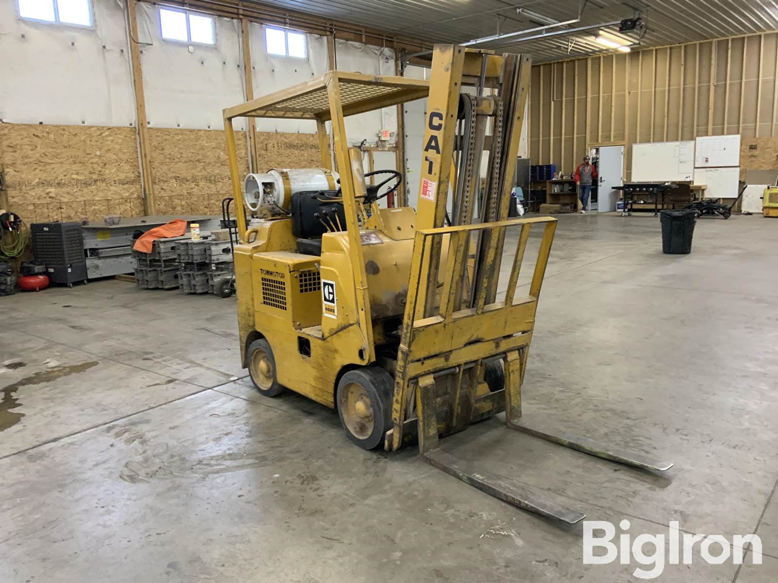 Caterpillar Towmotor 462S Forklift, 8295.9 hrs showing, Propane, 16.25 X 6 X11.25 Front Tires, 16.25 X 6 X11.25 Rear Tires, Cushion Tires, 7’ Lowered Height, 132" Max Fork Height, 3850# Max Load Capacity, 4” W X 36”L X 1 1/2” Thick Fork Dimensions (Thickness-Width-Length), Approximately 10’ Overall Length (rear to fork face), 36” Overall Width, 6695# Weight, Side Shift, Note: not operational due to hard to start, LP tank Included, SN: 462S661147, NOT OPERATIONAL DAY OF LISTING