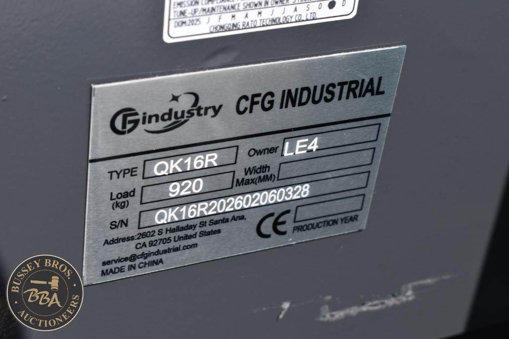 CFG Industrial Mini Excavator Hydraulic thumb, grading blade, digging bucket, rubber tracks, aux hydraulics, gas engine, toolbox, QK18R, SN#QK16R202602060328, NEW/UNUSED