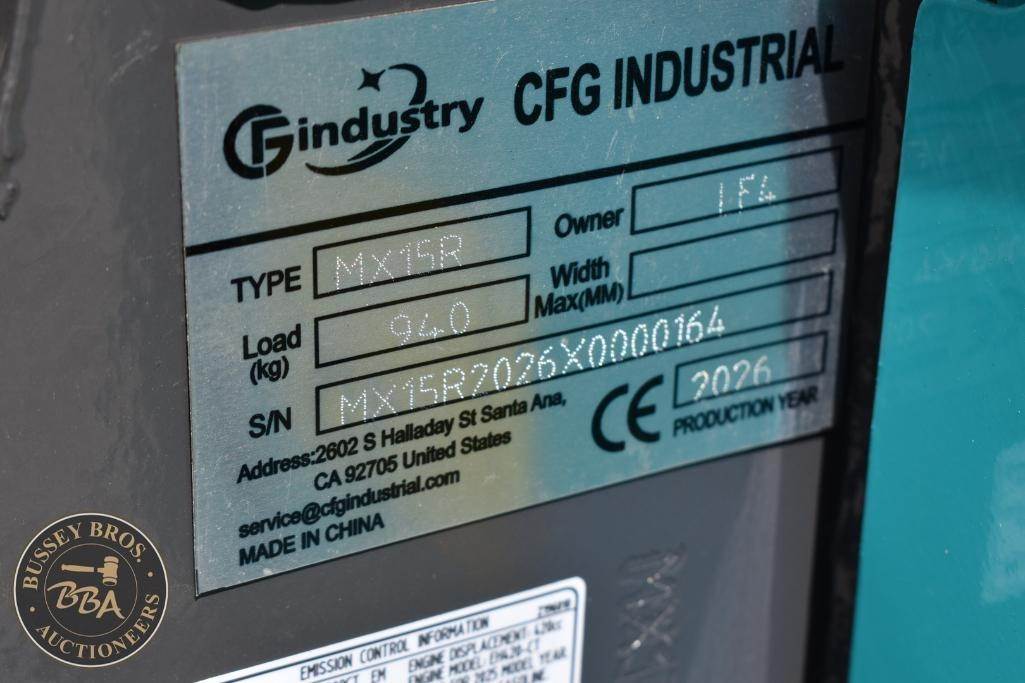 CFG Industrial Mini Excavator Manual thumb, grading blade, digging bucket, rubber tracks, aux hydraulics, gas engine, toolbox, MX15RXMX15R2026X0000164, NEW/UNUSED