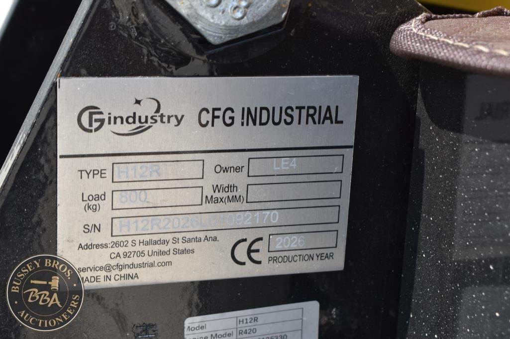 CFG Industrial Mini Excavator Manual thumb, grading blade, digging bucket, rubber tracks, gas engine, toolbox, H12R, SN#H12R2026L01092170, NEW/UNUSED