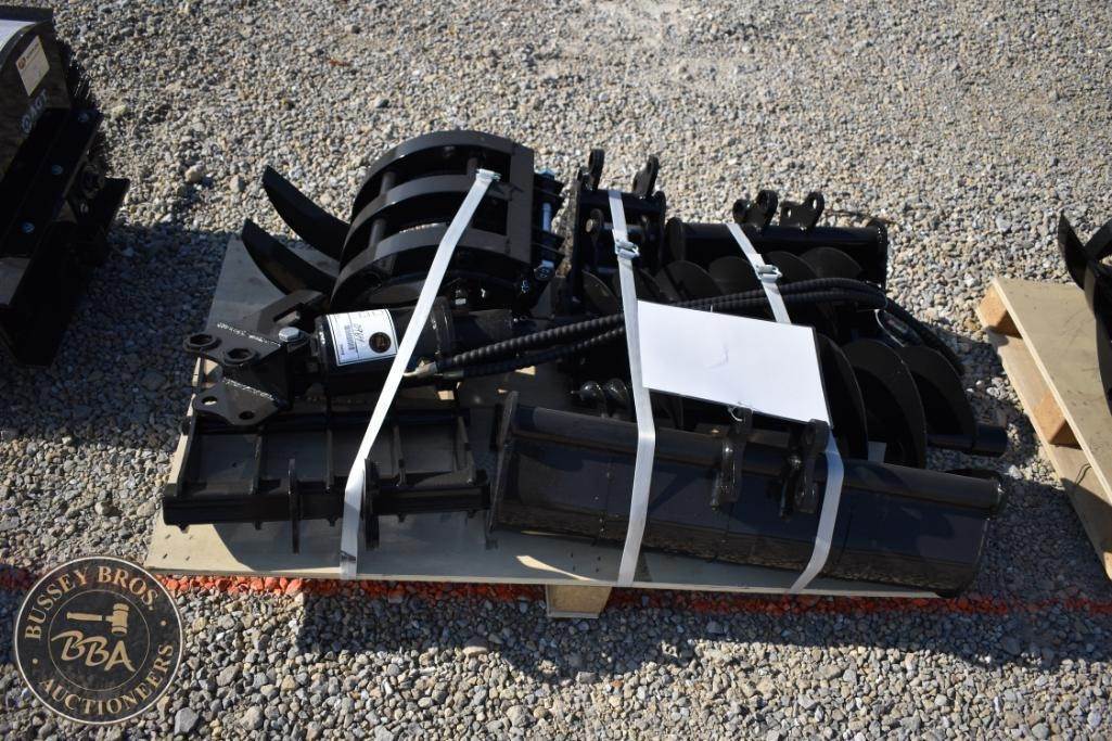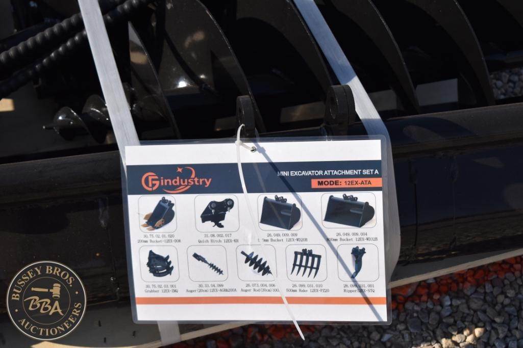 CFG Industry 12EX-ATA 12EX-ATA Mini Excavator Attachment Set, includes multiple attachment types such as buckets, augers, and thumbs, typically weighs around 800 lbs (363 kg), dimensions approximately 48 x 42 x 24 inches (122 x 107 x 61 cm), compatible with mini excavators with standard couplers, made from reinforced steel.