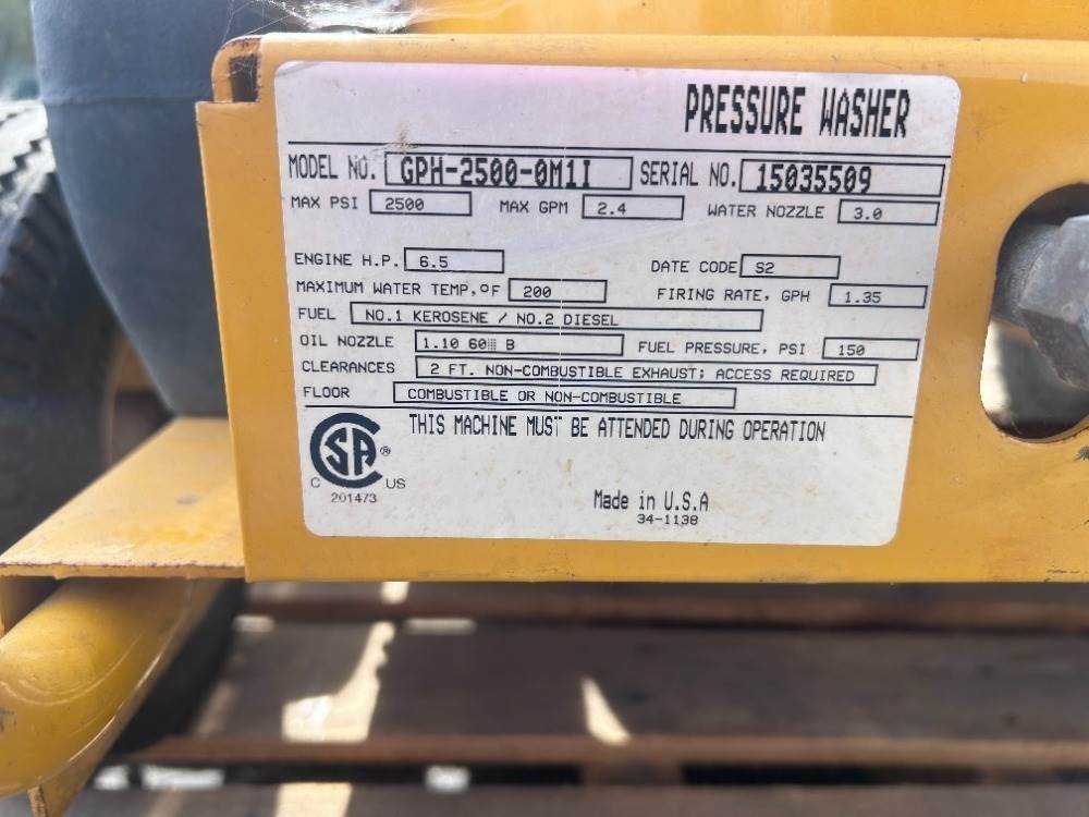 CHORE MASTER GPH/2500/0M1I HEATED PRESSURE WASHER 2500PSI, Briggs & Stratton gasoline. s/n:15035509 --(LOCATED IN COLTON, CA)--