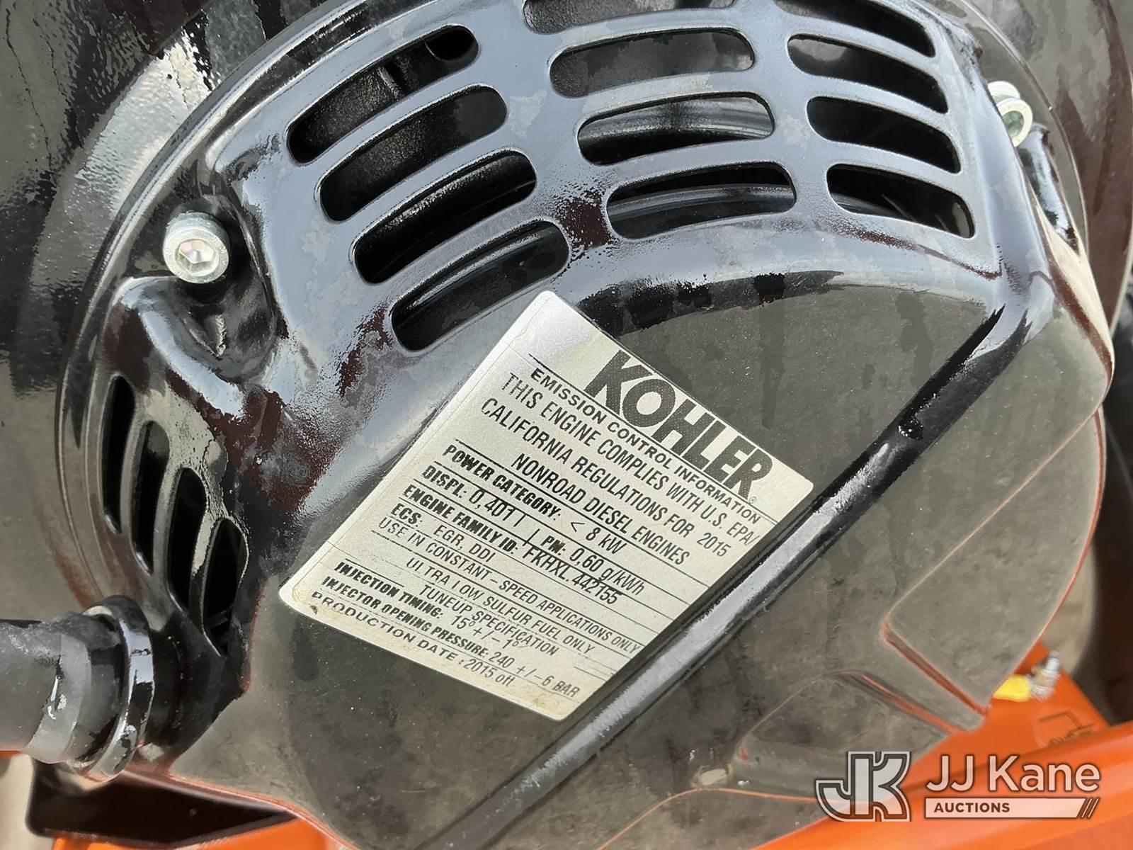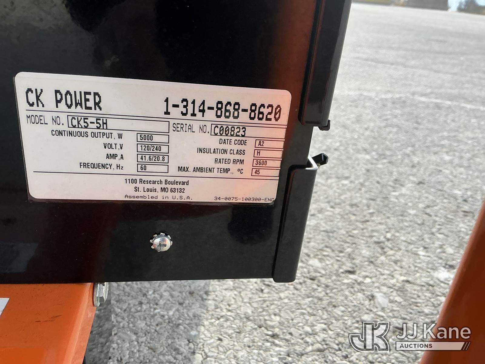 CK Power CK5-5H Portable Generator, s/n C00823, Kohler diesel, (Not Running, Condition Unknown, No Battery, Fuel Leak On Pump Hose) (Reads 50 hours) NOTE: This unit is being sold AS IS/WHERE IS via Timed Auction and is located in Kansas City, MO. Inspection & preview days for this unit are the 2 business days prior to the first day of items closing for this auction, item is located at 962 Tel Aviv Ave Kansas City, MO 64153 and hours of operations are 8a-4p. For pre-sale questions, please contact Ricky McPherson @ (816) 610-2250. (Buyer is responsible for removal. Assistance by consignor or JJ Kane Auctioneers is not assured.)