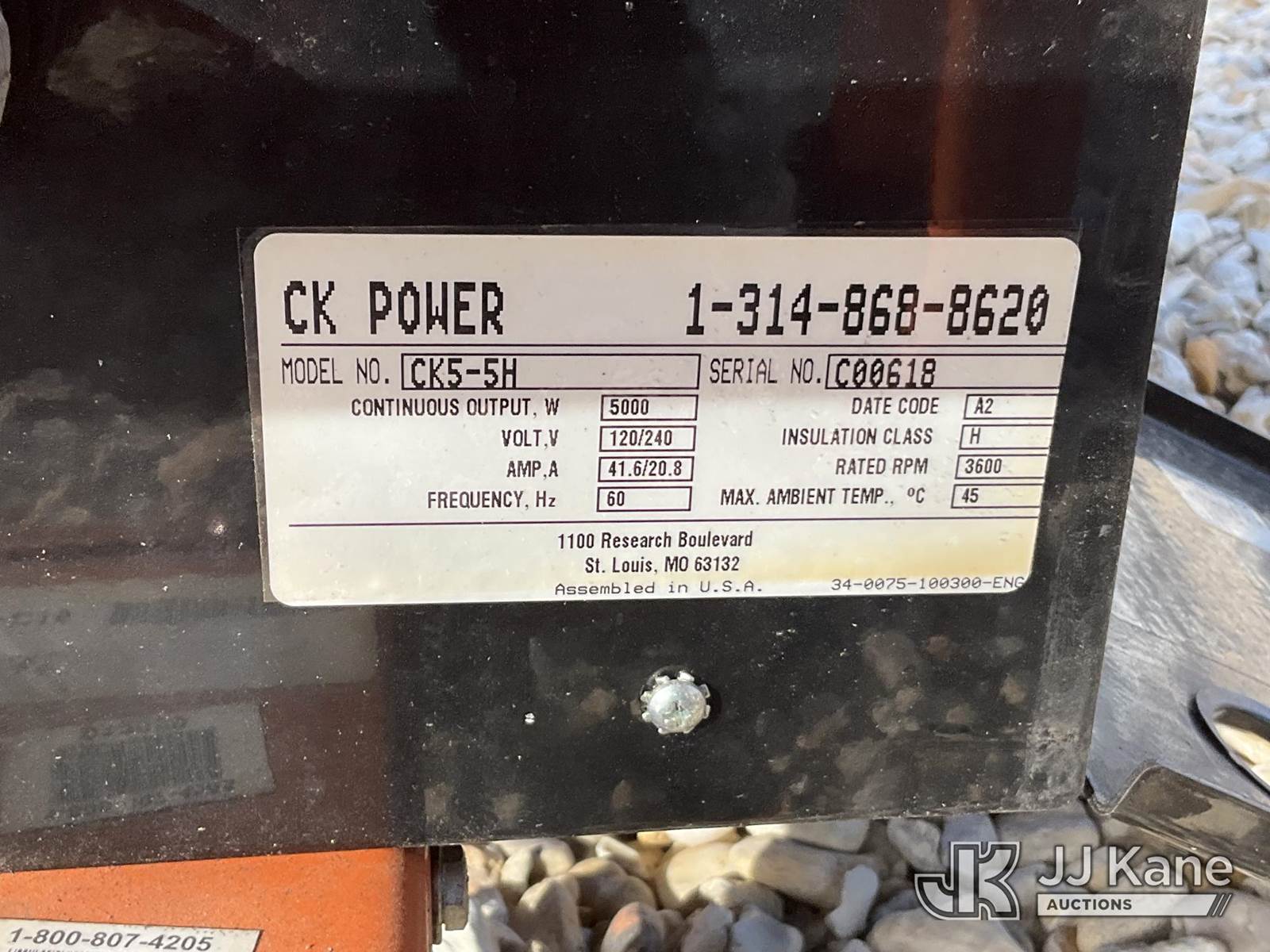 CK Power CK5-5H Portable Generator, s/n C00618, diesel, (Not Running, Condition Unknown) (Reads 94 hours) NOTE: This unit is being sold AS IS/WHERE IS via Timed Auction and is located in Robert, LA. Inspection & preview days for this unit are by appointment only; please contact us at contact@jjkane.com or 84-Go-JJKane for more details. License # LA AB-154 (Buyer is responsible for removal. Assistance by consignor or JJ Kane Auctions is not assured.)