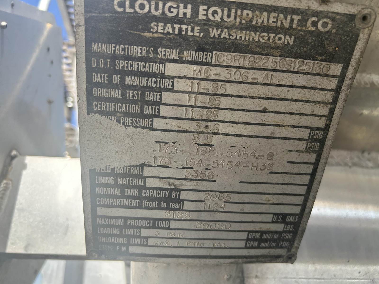 1986 CLOUGH, 3 COMPARTMENT PETROLEUM PUP, 5335 GALLONS, 2085/1124/2126, SPRING RIDE, ALUM WHEELS, LP 22.5 TIRES, HOSE TUBES