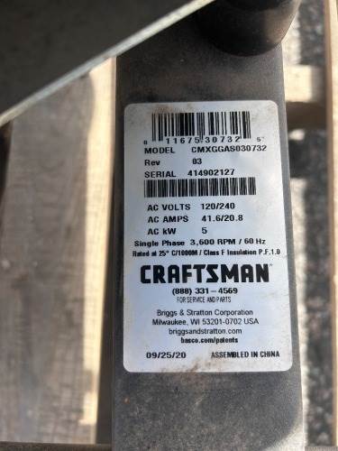 CRAFTSMAN CMXGGAS030732 GENERATOR, 5kw, Briggs & Stratton gasoline. s/n:414902127 --(LOCATED IN COLTON, CA)--