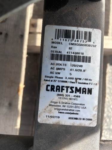 CRAFTSMAN CMXGGAS030732 GENERATOR, 5kw, Briggs & Stratton gasoline. s/n:411430018 --(LOCATED IN COLTON, CA)--