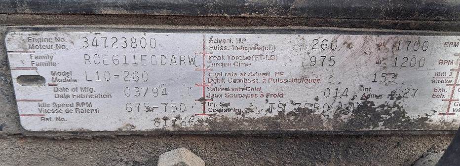 1994 Cummins L10, 260 HP, CPL-1870, S/N- 34723800, Turns 360.