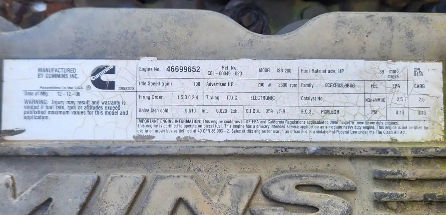 (Used) 2006 Cummins ISB 5.9, ENGINE ASSEMBLY- Family Number: 6CEXH0359BAG, Displacement: 5.9L, Horsepower: 200, Ar.No./CPL: 8136, Serial Number: 46699652, Part Number: C01-00049-020, E.C.S: PCM, EGR, For more information about this item, give us a call. We ship Worldwide! (CRG HEAVY TRUCK PARTS) 929 W PULASKI HWY ELKTON, MD 21921, Serial#: 46699652, Horse Power: 200, ARR/CPL: 8136, Casting#: 46699652