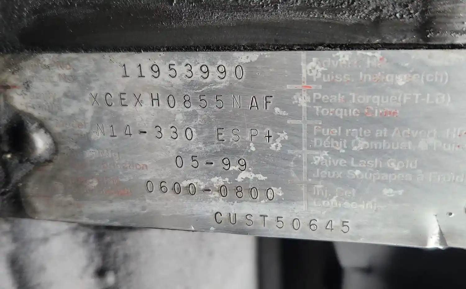 (Used) 1999 Cummins N14-330, ENGINE ASSEMBLY- Family Number: XCEXH0855NAF, Displacement: 14.0L, Horsepower: 330, Ar.No/CPL: 2590, Serial Number: 11953990, Part Number: CUST50645, E.C.S: PCM, For more information about this item, give us a call. We ship Worldwide! (CRG HEAVY TRUCK PARTS) 929 W PULASKI HWY ELKTON, MD 21921, Serial#: 11953990, Horse Power: 330, ARR/CPL: 2590, Casting#: 11953990