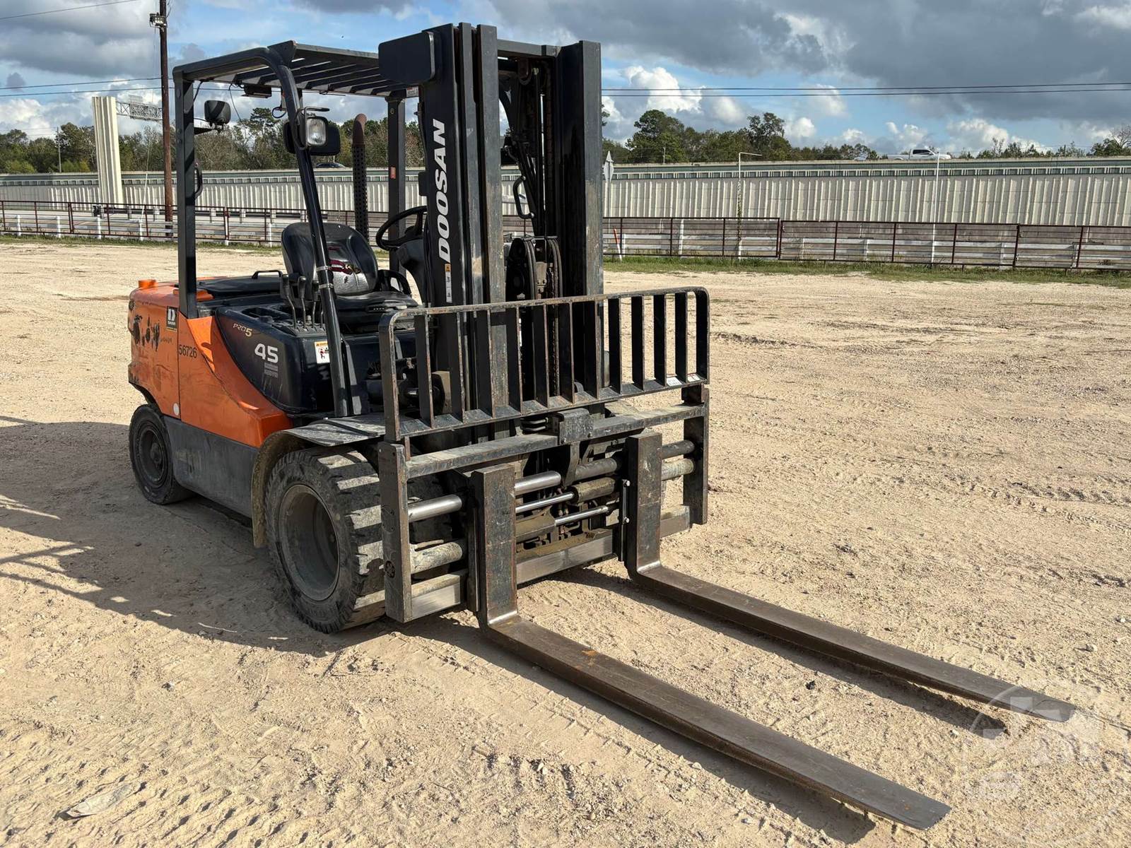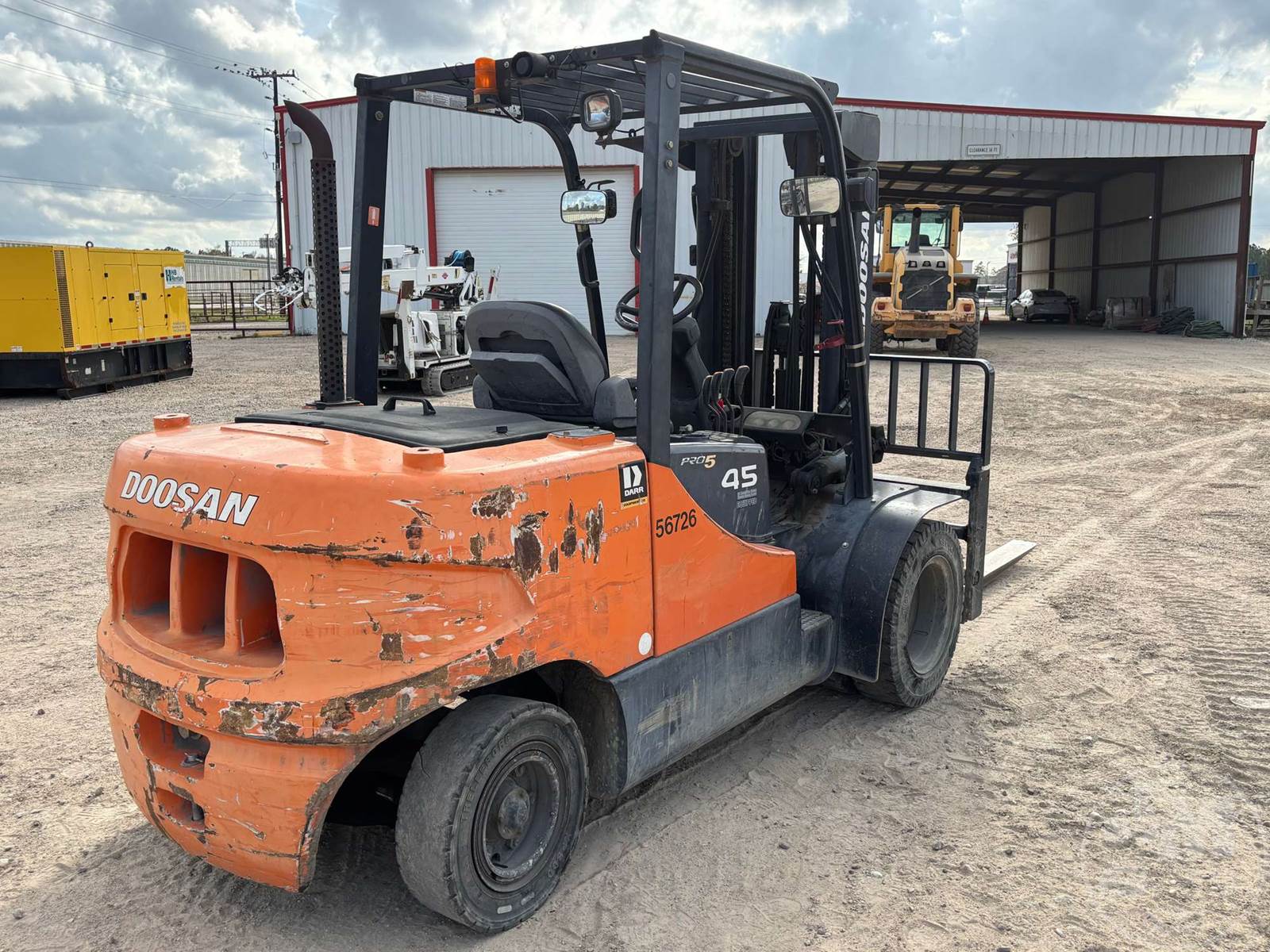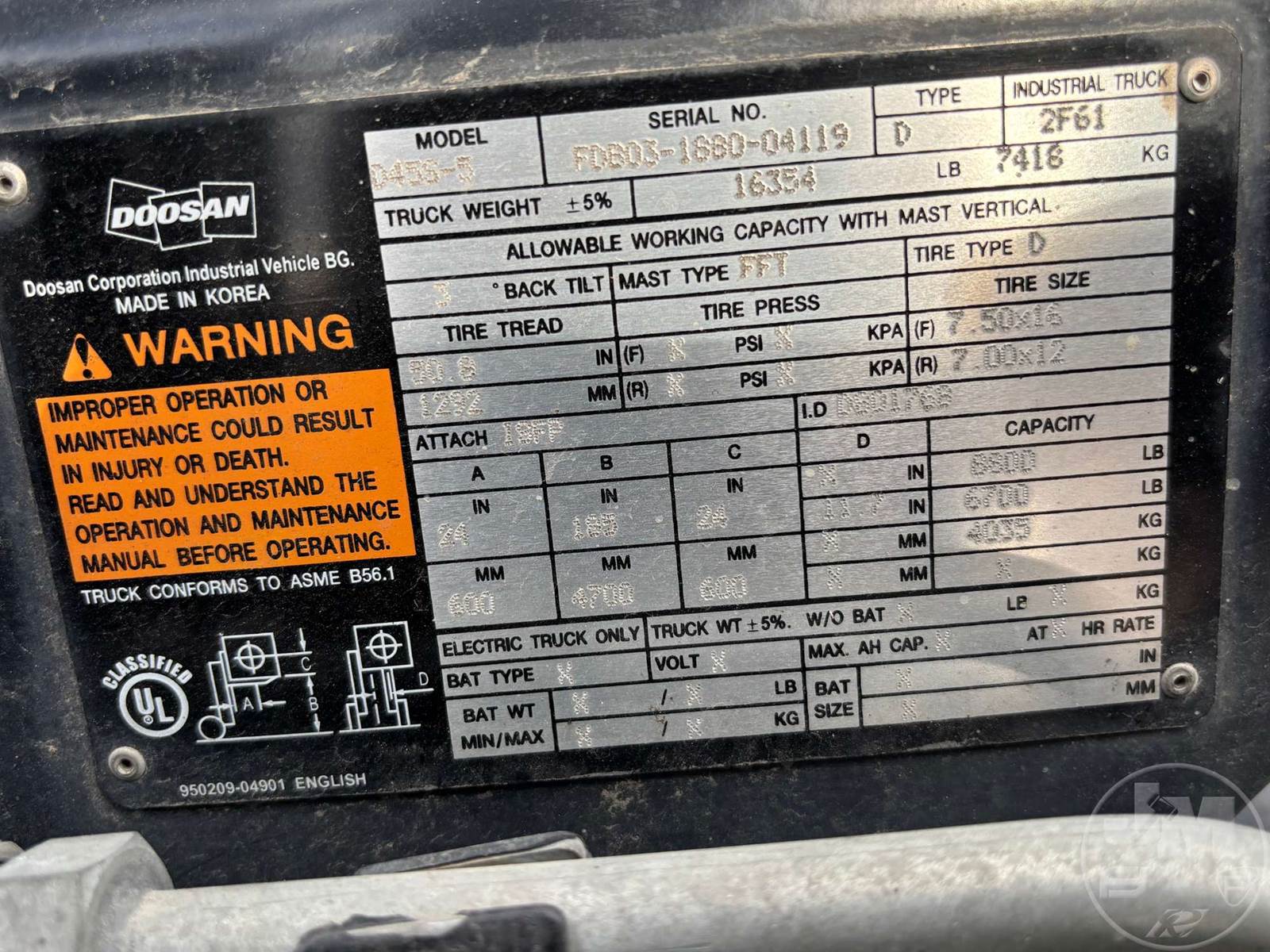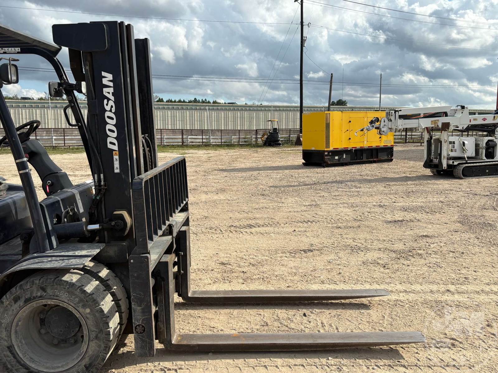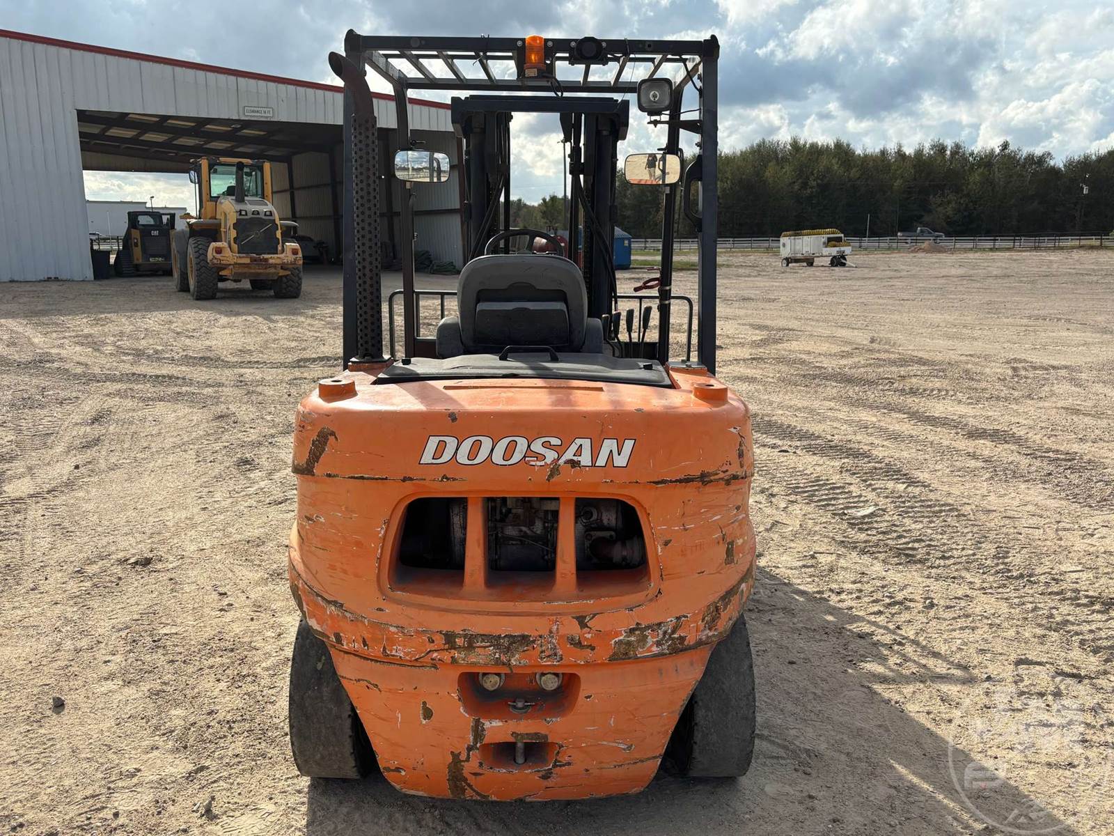 DOOSAN 8000 LB CUSHION TIRE FORKLIFT, 6 CYLINDER DIESEL, CAB, SIDE SHIFT, 3 STAGE MAST, 72 IN. FORKS, HOUR METER READS: 7585