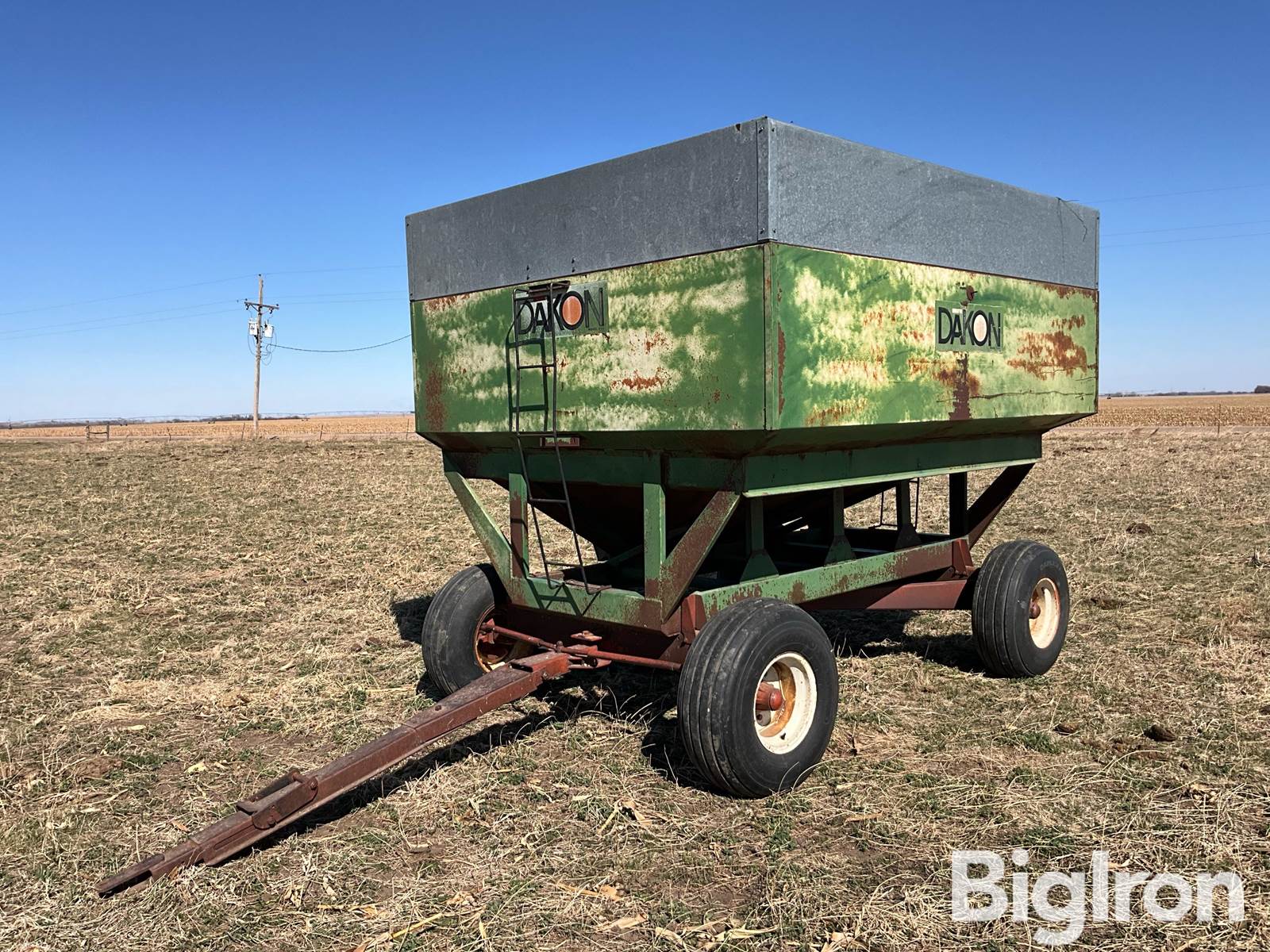 Dakon 280 Gravity Wagon, Steel Construction, Box Dimensions: 10’ Long X 8’ Wide, 18" Tall Sidewall Extensions, RH Discharge, Discharge Chute, Front & Rear Access Ladders, Dakon Model 1212 Running Gear, Extendible Pin Hitch, Rear Hitch, 12.5L-15SL Tires On 8-Bolt Hubs