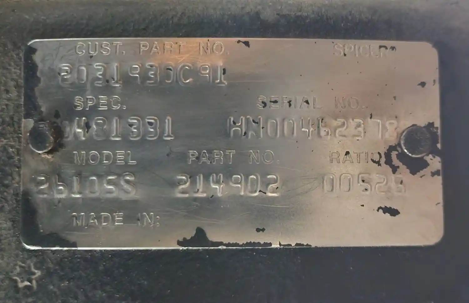 (Used) 2001 International 4900, COMPLETE REAR DIFFERENTIAL- Part Number: 214902, Serial Number: HN00462378, Make: Spicer, Model: 26105S, Ratio: 5.25, Capacity: 26,000 Lbs, Hub Bolts: 10, Brake Type: Drum, Suspension: Leaf Springs, Reference images for condition, For more information about this item, give us a call. We ship Worldwide! (CRG HEAVY TRUCK PARTS) 929 W PULASKI HWY ELKTON, MD 21921, Serial#: HN00462378, Hub Bolts: 10, Ratio: 5.25, Brake Type: Drum