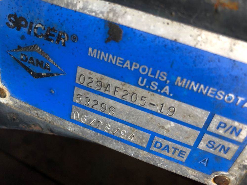 New Surplus Spicer/Dana Rear Axle Housing, F155S (RA39) , 6 Hole Budd, Hydraulic Disc Brakes, 53 1/2" Inner Flange to Flange, 12 Hole Flange, P/N 029AF205-19, S/N 53296