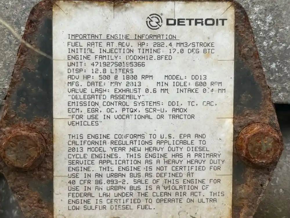 (Used) 2013 DETROIT DIESEL DD13, ENGINE ASSEMBLY- Family Number: DDDXH12.8FED, Displacement: 12.8L, Horsepower: 500, Serial Number: 471927S0195366, Part Number: C01-00183-961, ECS: DDI, TC, CAC, ECM, EGR, OC, PTOX, SCR-U, AMOX, Reference images for condition For more information about this item, give us a call. We ship Worldwide! (CRG HEAVY TRUCK PARTS) 929 W PULASKI HWY ELKTON, MD 21921, Serial#: 471927S0195366, Horse Power: 500, Casting#: 471927S0195366