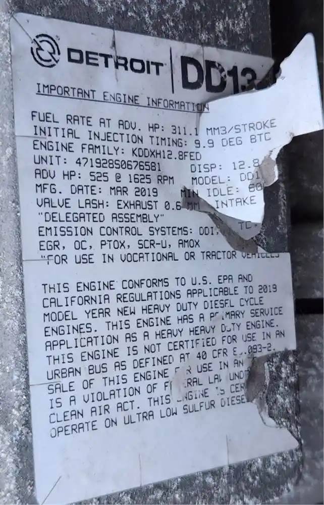 (Used) 2019 Detroit DD13, ENGINE ASSEMBLY- Family Number: KDDXH12.8FED, Displacement: 12.8L, Horsepower 525, Serial Number: 471928S0676581, Part Number: C01-00285-021, E.C.S: DDI, TC, CAC, ECM, EGR, OC, PTOX, SCR-U, AMOX, For more information about this item, give us a call. We ship Worldwide! (CRG HEAVY TRUCK PARTS) 929 W PULASKI HWY ELKTON, MD 21921, Serial#: 471928S0676581, Horse Power: 525, Casting#: 471928S0676581