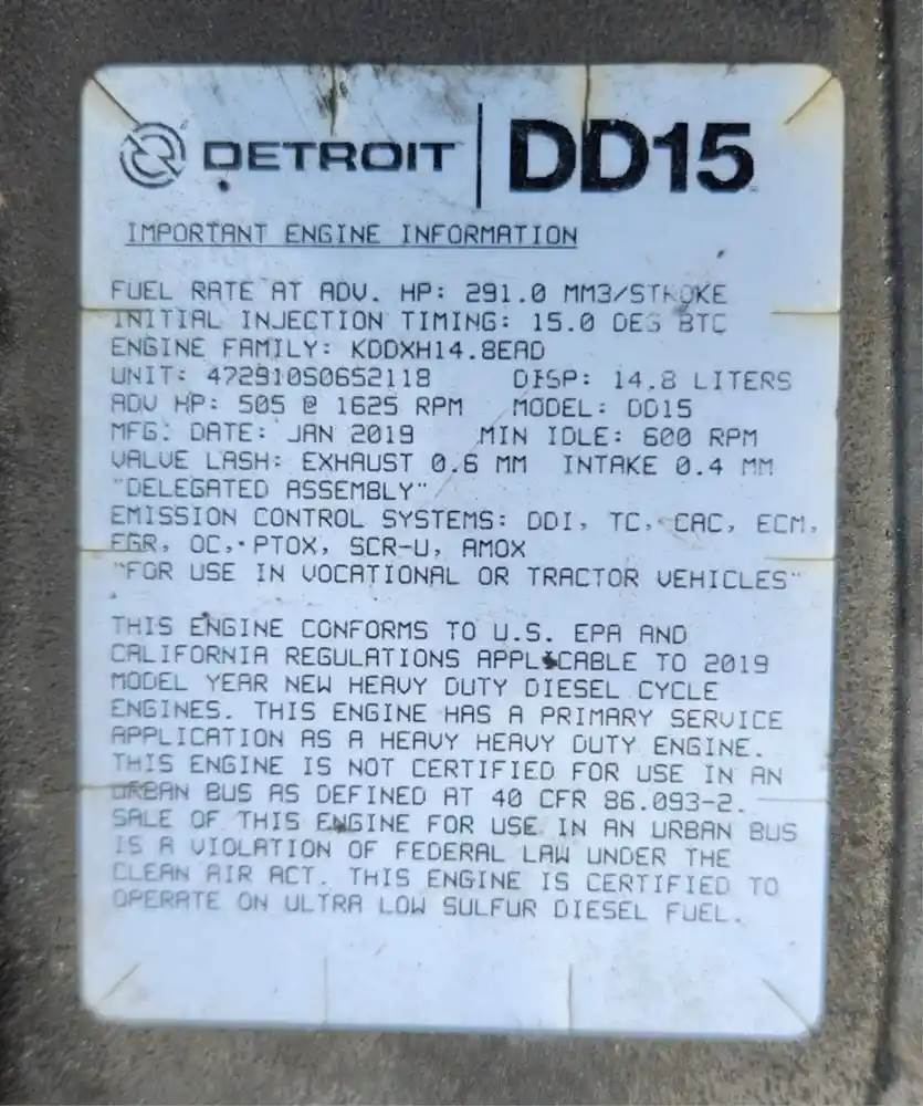 (Used) 2019 Detroit DD15, ENGINE ASSEMBLY- Family Number: KDDXH14.8EAD, Displacement: 14.8L, Horsepower: 505, Serial Number: 472910S0652118, Part Number: C01-00237-805, E.C.S: DDI, TC, CAC, ECM, EGR, OC, PTOX, SCR-U, AMOX, For more information about this item, give us a call. We ship Worldwide! (CRG HEAVY TRUCK PARTS) 929 W PULASKI HWY ELKTON, MD 21921, Serial#: 472910S0652118, Horse Power: 505, Casting#: 472910S0652118