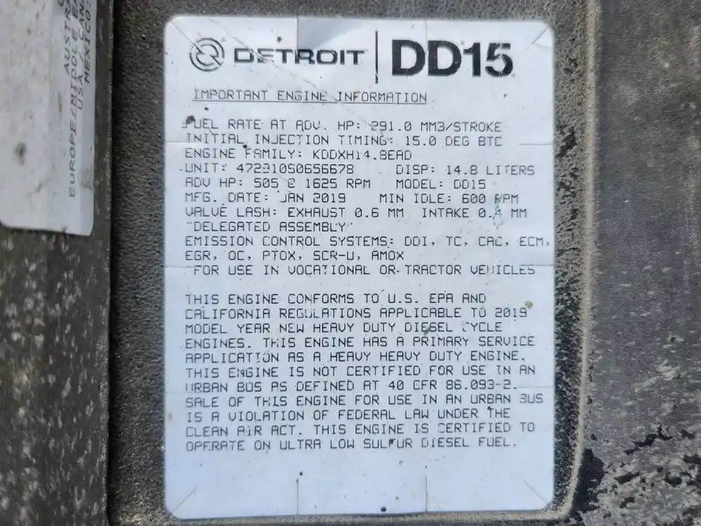 (Used) 2019 Detroit DD15, ENGINE ASSEMBLY- Family Number: KDDXH14.8EAD, Displacement: 14.8L, Horsepower: 505, Serial Number: 472910S0656678, Part Number: C01-00237-771, E.C.S.: DDI, TC, CAC, ECM, EGR, OC, PTOX, SCR-U, AMOX, For more information about this item, give us a call. We ship Worldwide! (CRG HEAVY TRUCK PARTS) 929 W PULASKI HWY ELKTON, MD 21921, Serial#: 472910S0656678, Horse Power: 505, Casting#: 472910S0656678