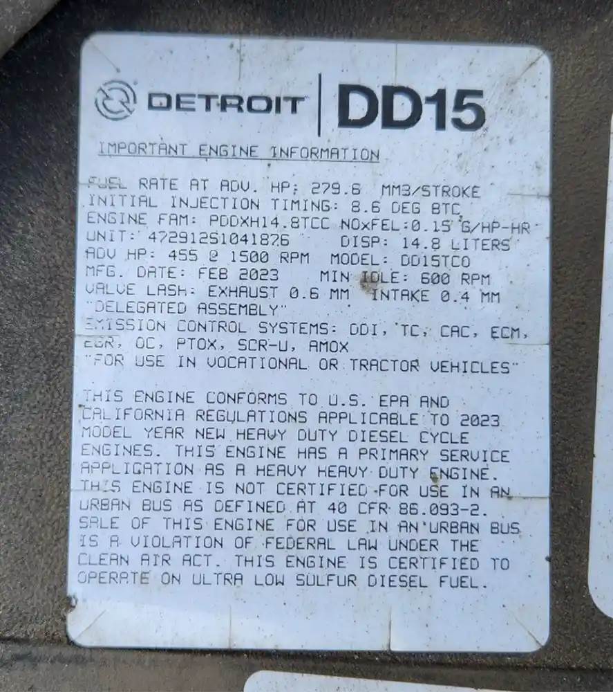 (Used) 2023 Detroit DD15, ENGINE ASSEMBLY- Family Number: PDDXH14.8TCC, Displacement: 14.8L, Horsepower: 455, Serial Number: 472912S1041876, E.C.S: DDI, TC, CAC, ECM, EGR, OC, PTOX, SCR-U, AMOX, For more information about this item, give us a call. We ship Worldwide! (CRG HEAVY TRUCK PARTS) 929 W PULASKI HWY ELKTON, MD 21921, Serial#: 472912S1041876, Horse Power: 455, Casting#: 472912S1041876