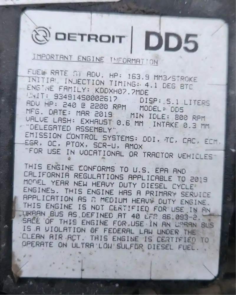 (Used) 2019 Detroit DD5, ENGINE ASSEMBLY- Family Number: KDDXH07.7MDE, Displacement: 5.1L, Horsepower: 240, Serial Number: 934914S0002617, Part Number: C01-00247-127, E.C.S: DDI, TC, CAC, ECM, EGR, OC, PTOX, SCR-U, AMOX, For more information about this item, give us a call. We ship Worldwide! (CRG HEAVY TRUCK PARTS) 929 W PULASKI HWY ELKTON, MD 21921, Serial#: 934914S0002617, Horse Power: 240, Casting#: 934914S0002617
