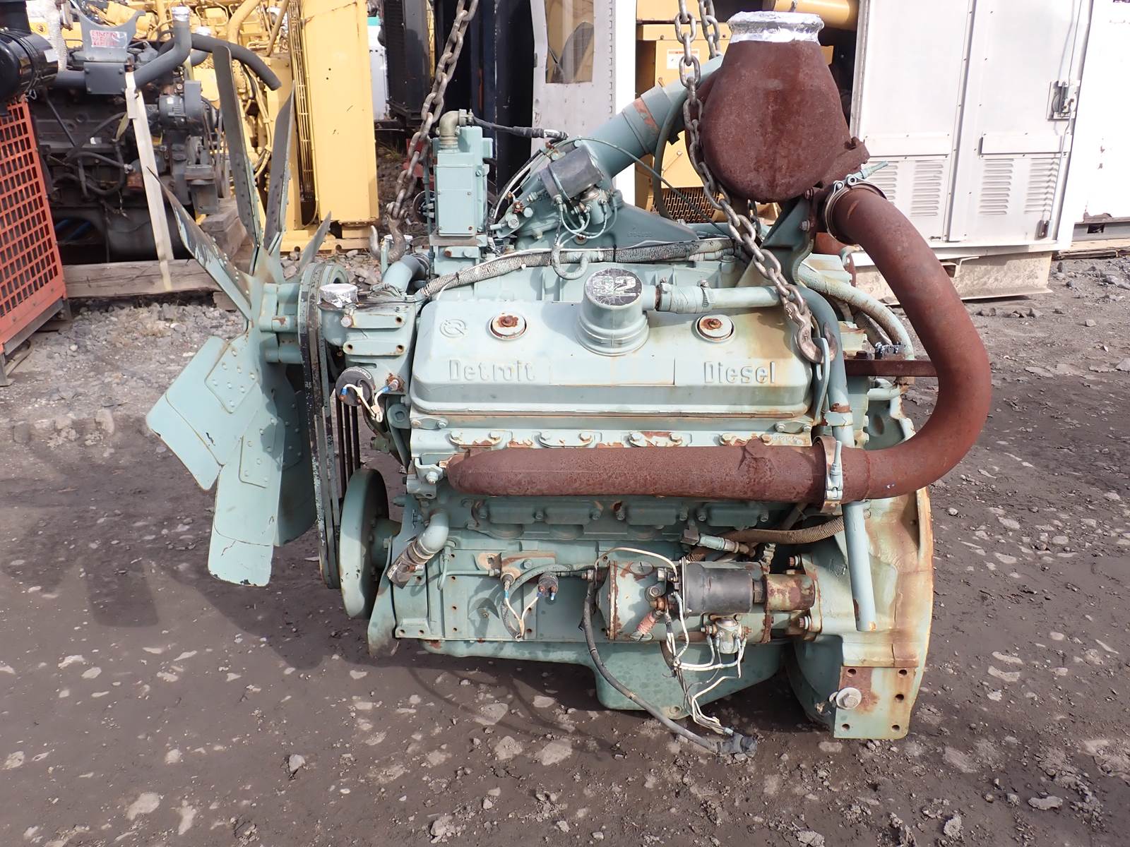 Detroit Diesel 8V92TA industrial engine, turbocharged, mechanical fuel system, 8083-7305 model code. 441 HOURS ON METER WHEN REMOVED FROM BACKUP GENSET, SEE VIDEO -- ENGINE RUNS LIKE NEW -- GOOD OIL PRESSURE, VERY CLEAN ORIGINAL CONDITION!