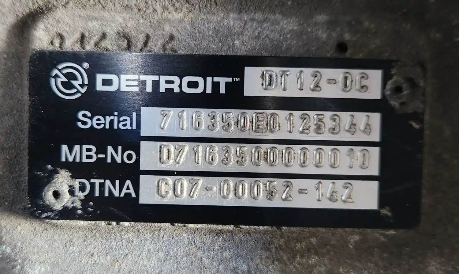 (Used) 2020 Detroit (AT), TRANSMISSION ASSEMBLY- Model: DT12-OC, Serial Number: 716350E0125344, Part Number: C07-00052-142, For more information about this item, give us a call. We ship Worldwide! (CRG HEAVY TRUCK PARTS) 929 W PULASKI HWY ELKTON, MD 21921, Serial#: 716350E0125344, Engine Make: Detroit, Engine Model: DD15, Casting#: 716350E0125344