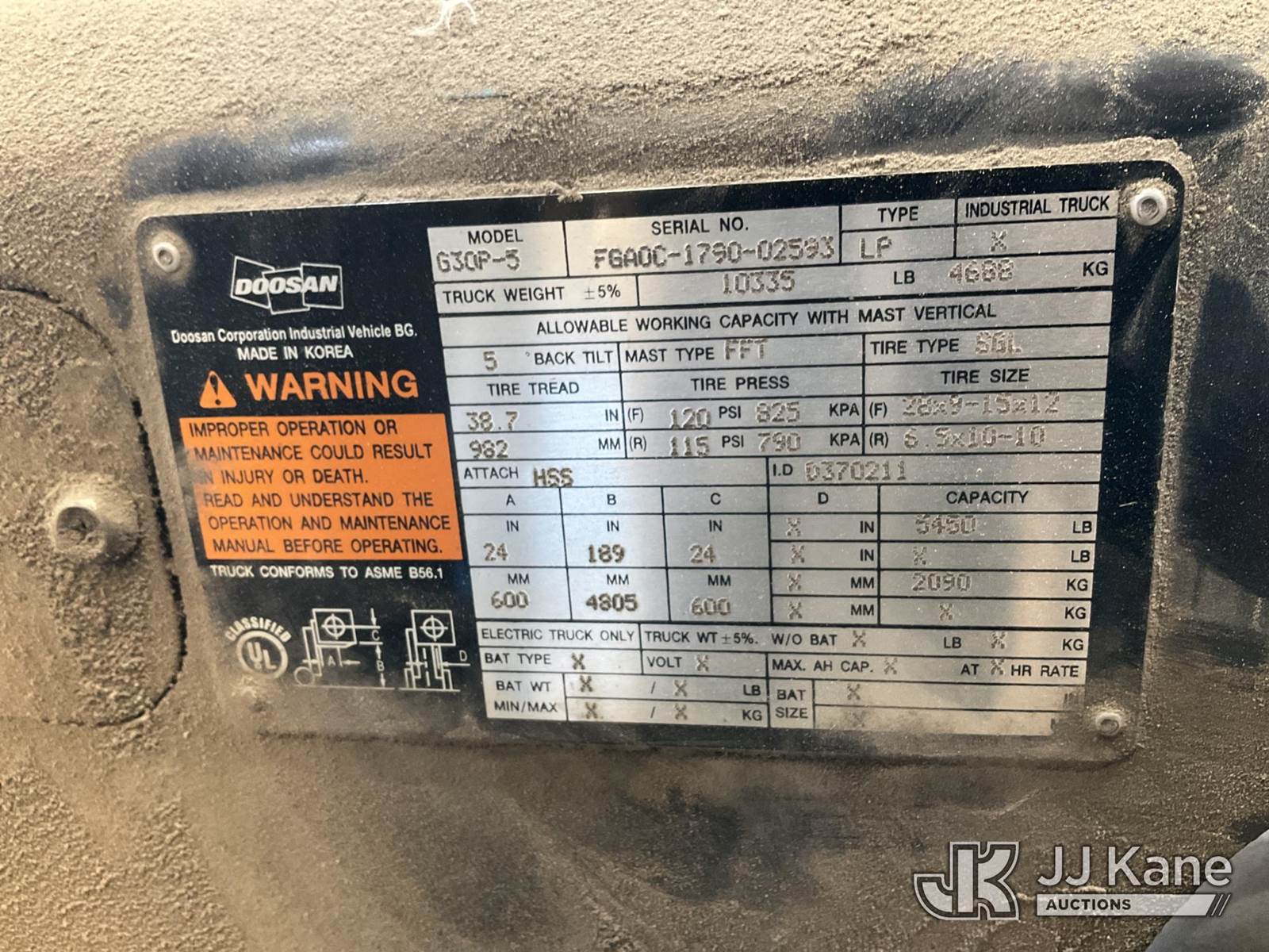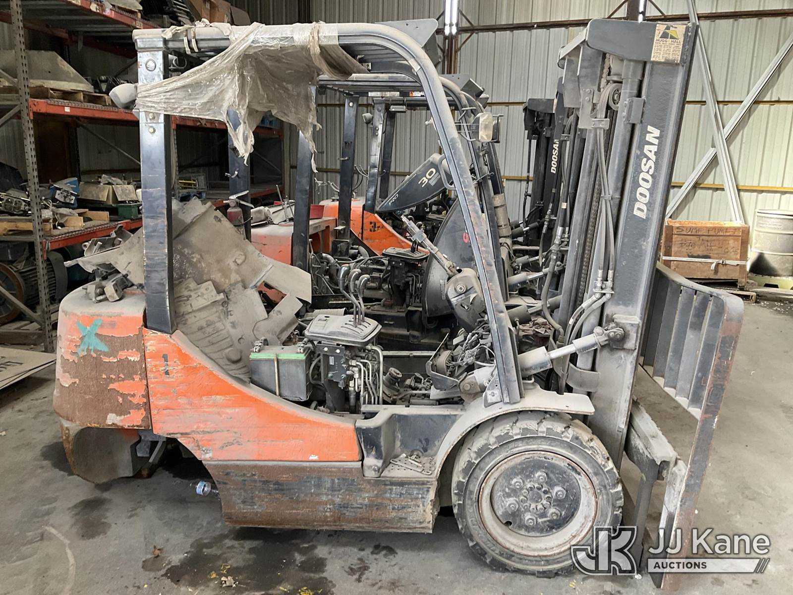 Doosan G30P-5 Forklift, s/n FGAOC-1790-02593, LPG, Shuttle, with 5450lbs capacity, 189in fork height, (Not Running, Condition Unknown, Parts Machine, Hours Unknown) NOTE: This unit is being sold AS IS/WHERE IS via Timed Auction and is located in Tulsa, OK. For more information & removal arrangements please contact Ben Cox @ (572) 235-0552. (Buyer is responsible for removal. Assistance by consignor or JJ Kane Auctions is not assured.)