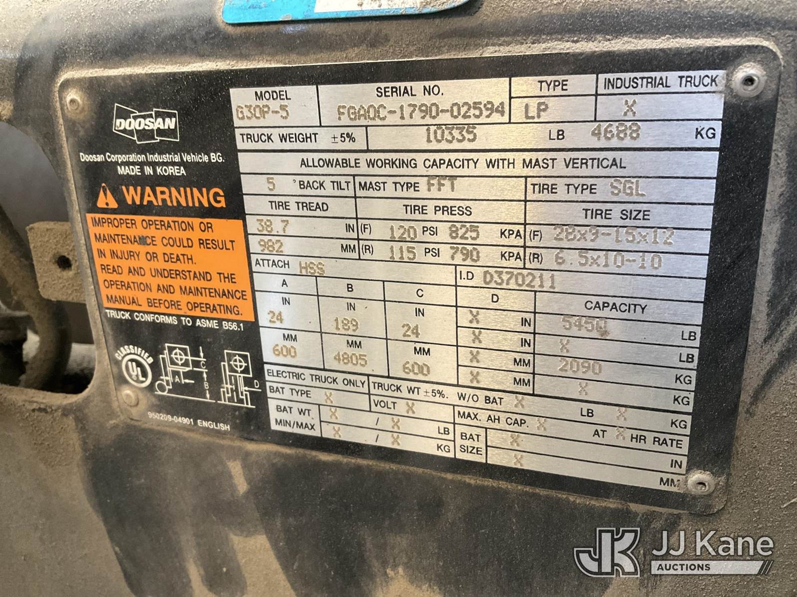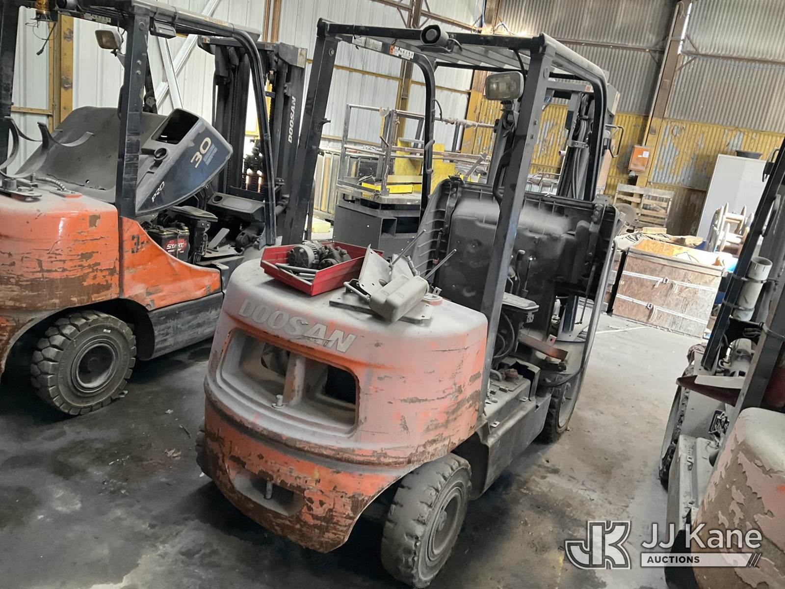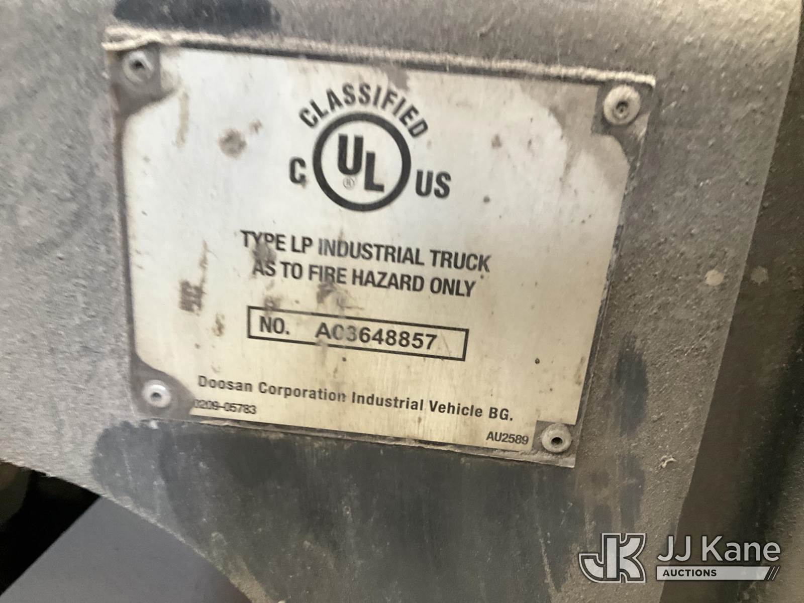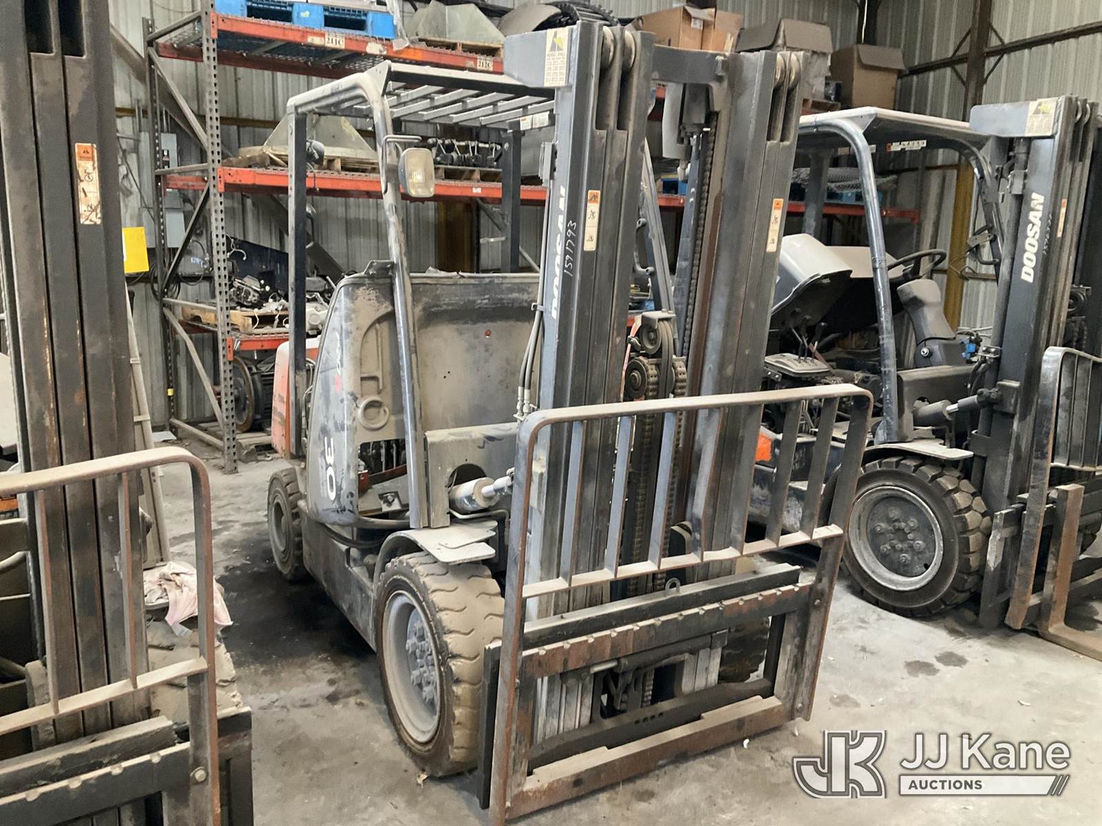 Doosan G30P-5 Solid Tired Forklift, s/n FGAOC-1790-02594, LP, Shuttle, with 5,450 lb. max lift capacity, 186 in. mast height, 48 in. forks & ROPS, (Not Running, Condition Unknown) (Parts Machine, Hours Unknown) NOTE: This unit is being sold AS IS/WHERE IS via Timed Auction and is located in Tulsa, OK. For more information & removal arrangements please contact Ben Cox @ (572) 235-0552. (Buyer is responsible for removal. Assistance by consignor or JJ Kane Auctions is not assured.)