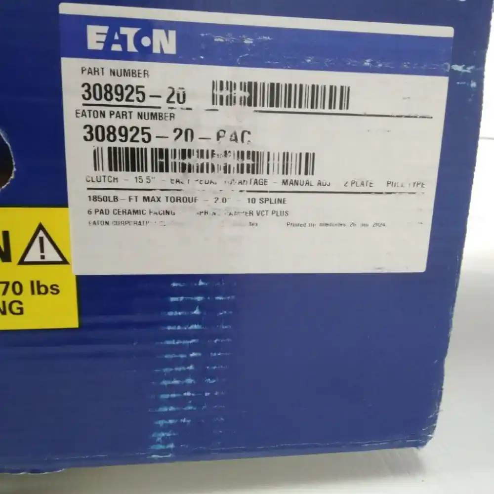 Genuine Paccar / Eaton Easy Pedal Advantage Clutch - Manual Adjust 15.5" p/n 308925-20 . EATON 308925-20 Part Description Manufacturer EATON Product Description 308925-20 - Easy Pedal Advantage Manual Clutch 15.5" 1860 Ft Lb EATON 308925-20 Specifications Product Attributes Clutch Disc Diameter 15.5 in Input Shaft Diameter 2 in-10 Pad Quantity 6 Clutch Adjustment Type Manual adjust Clutch Max Torque (lb-ft) 1860 Clutch Style / Marketing Name Easy Pedal Advantage Disc Damper Spring Count 7 Flywheel Bore Opening 10.00 in Number of Discs 2 Pad Type Button, Core Charge: 0.00