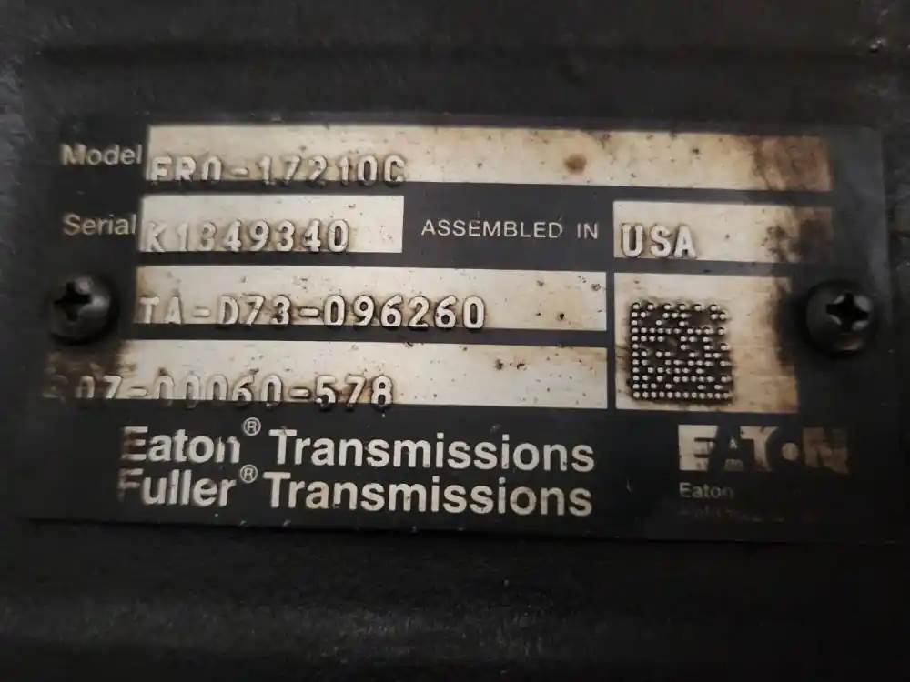 (Used) 2019 Eaton/Fuller (MT), TRANSMISSION ASSEMBLY- Model: FR0-17210C, Serial Number: K1349340, Part Number: TA-D73-096260, Engine: Detroit DD15, For more information about this item, give us a call. We ship Worldwide! (CRG HEAVY TRUCK PARTS) 929 W PULASKI HWY, ELKTON, MD 21921, Serial#: K1349340, Engine Make: Detroit, Casting#: K1349340, Engine Model: DD15