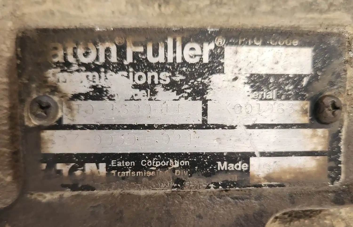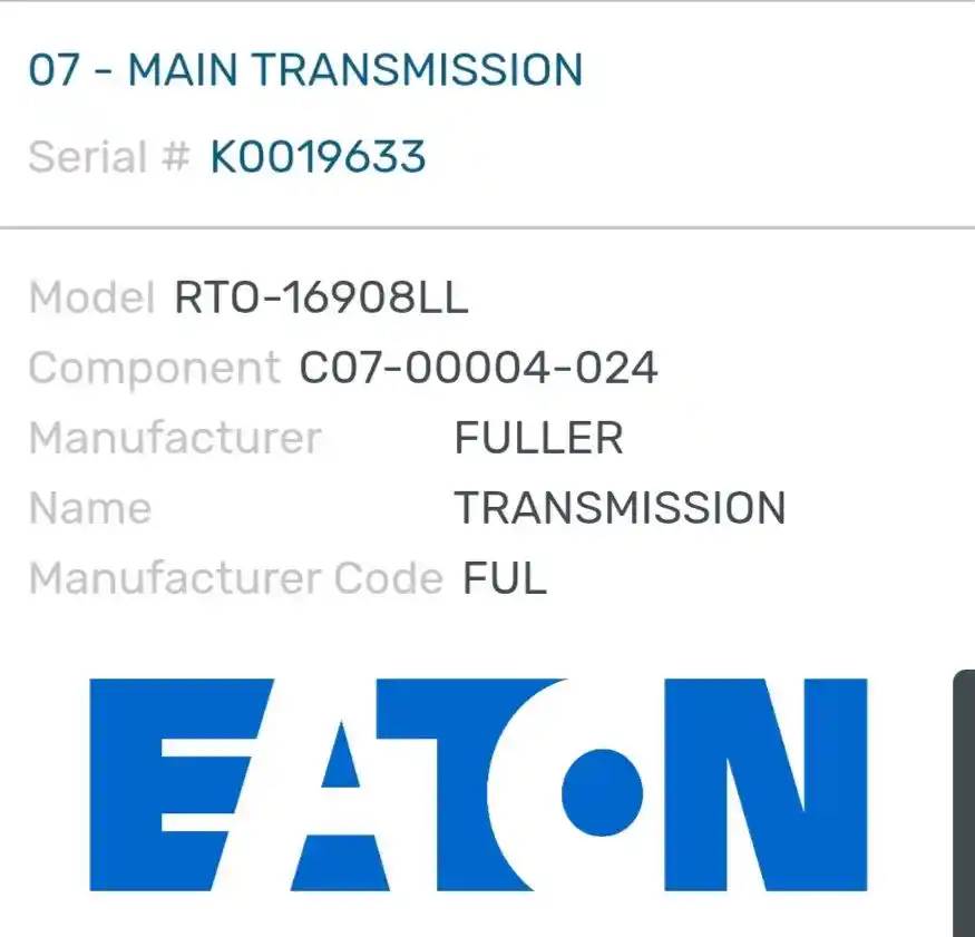 (Used) 1999 Eaton/Fuller (MT), TRANSMISSION ASSEMBLY- Model: RTO16908LL, Serial Number: K0019633, Part Number: C07-00004-024, Engine: Caterpillar C12, For more information about this item, give us a call. We ship Worldwide! (CRG HEAVY TRUCK PARTS) 929 W PULASKI HWY ELKTON, MD 21921, Serial#: K0019633, Engine Make: Caterpillar, Engine Model: C12, Casting#: K0019633