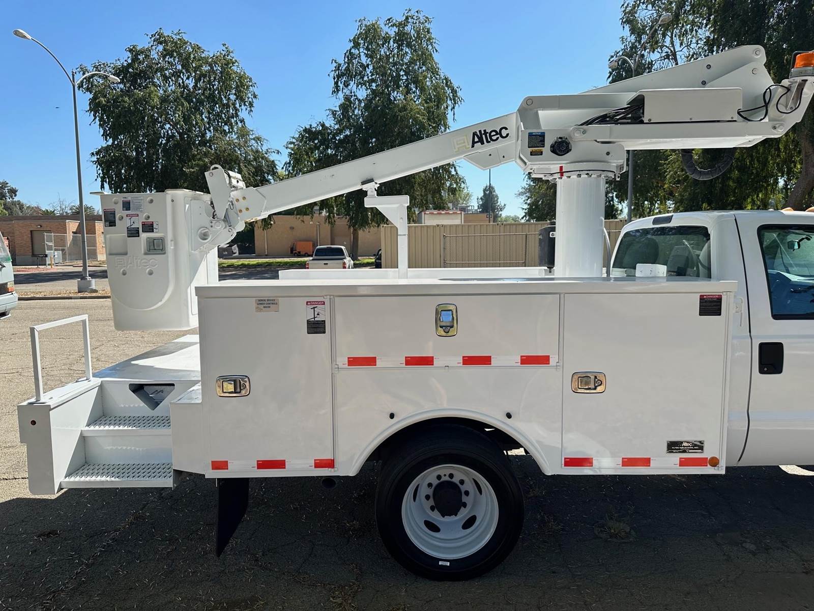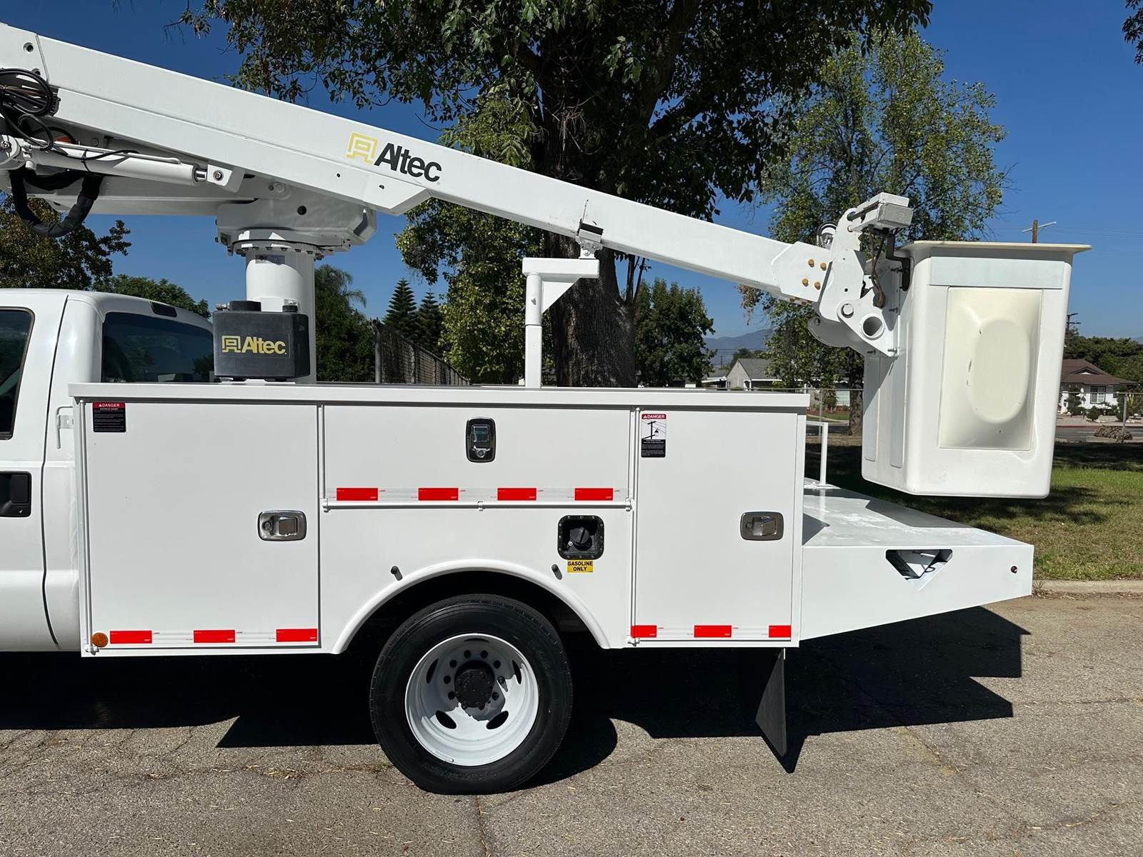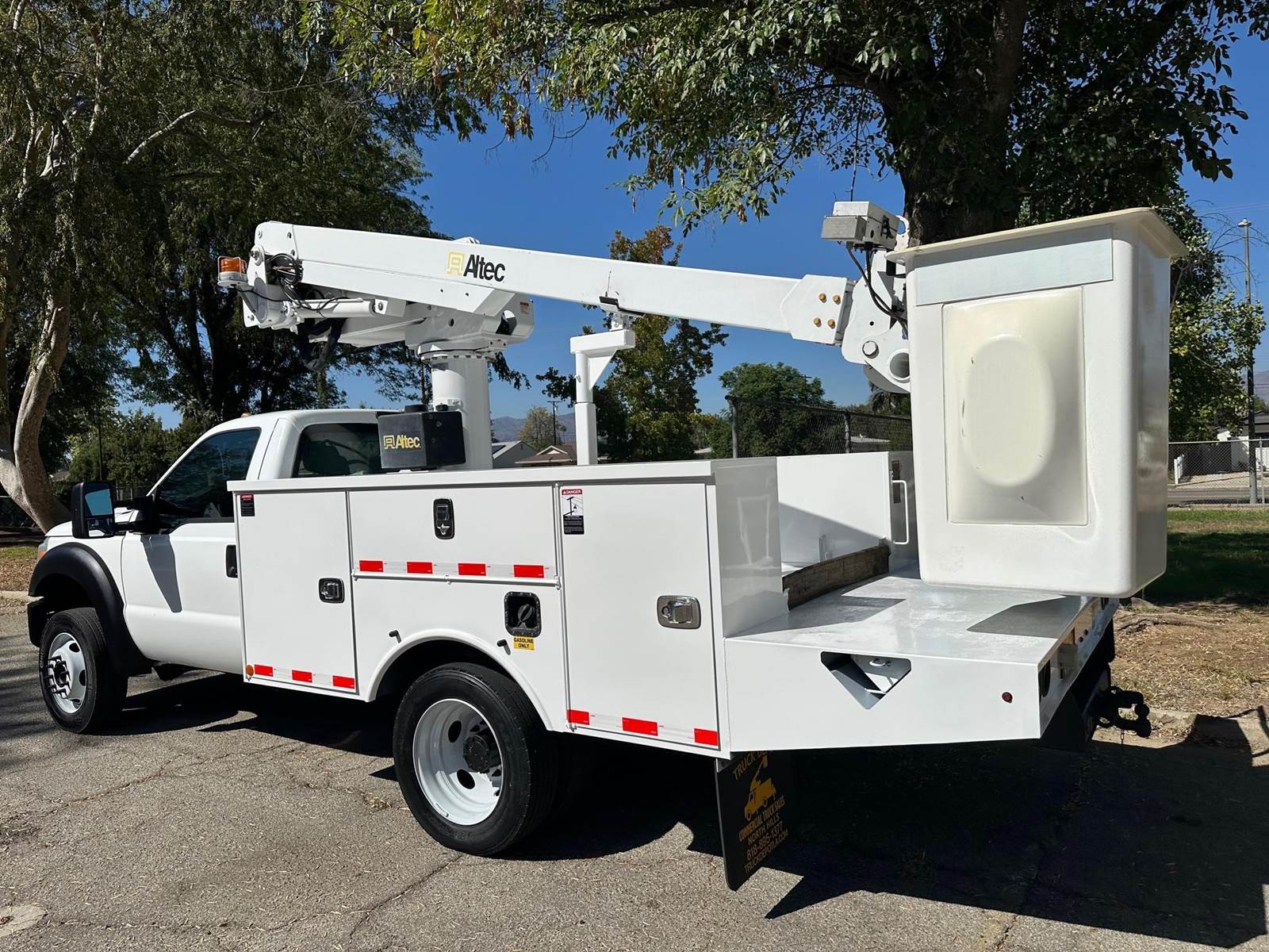 2015 Ford F-450 Bucket Truck, 6.8L V-10, auto trans, A/C, tilt, cruise, 138k miles, P.T.O. driven boom, strobe lights, Altec AT235 boom, 35' platform height, 42' working height, 350 lbs. capacity, Magnum Energy power inverter, 12' Altec steel service body, slide lock security bar, tow pkg, new tires, just serviced, runs & operates great. Nationwide shipping and financing are available.
