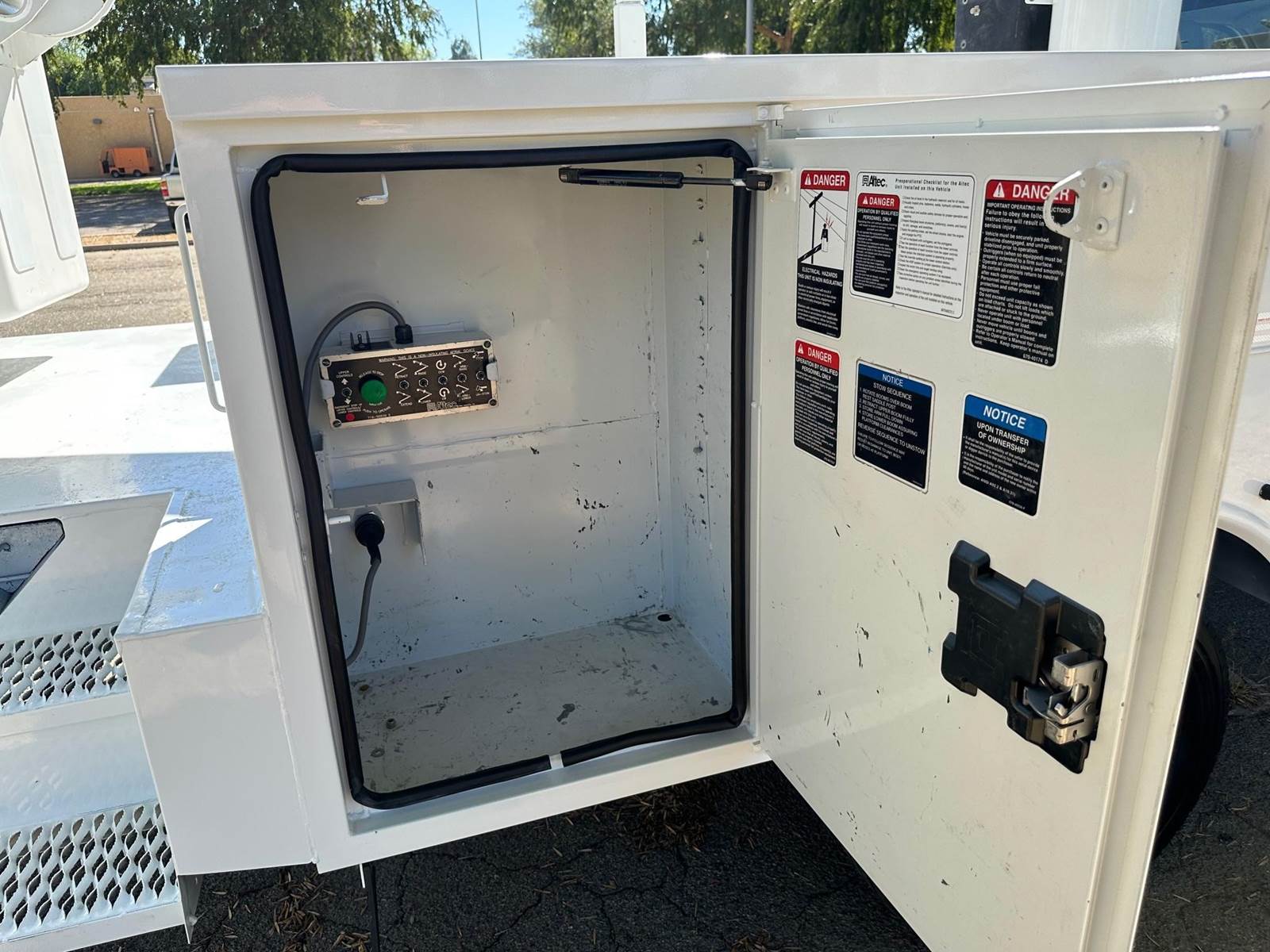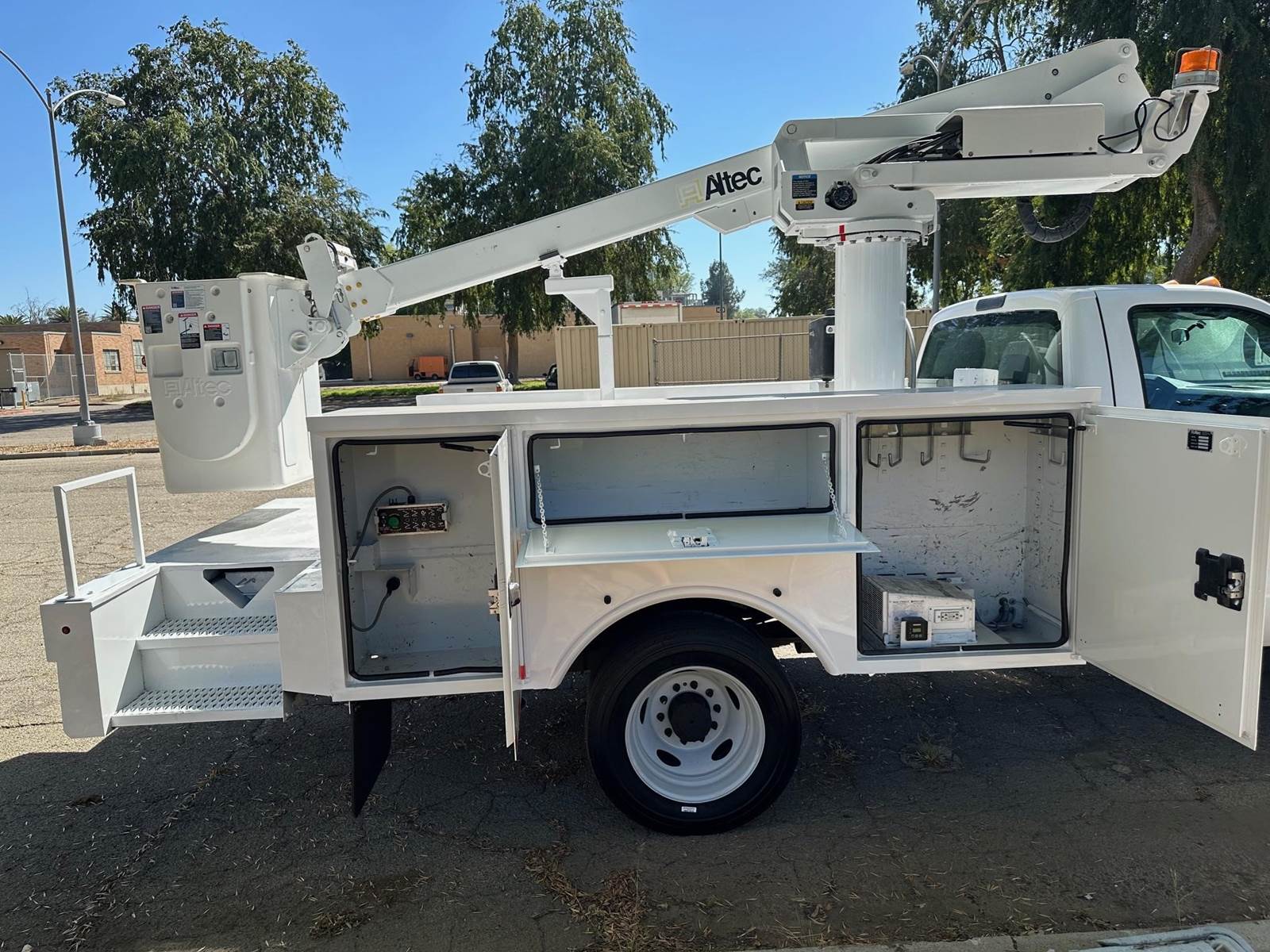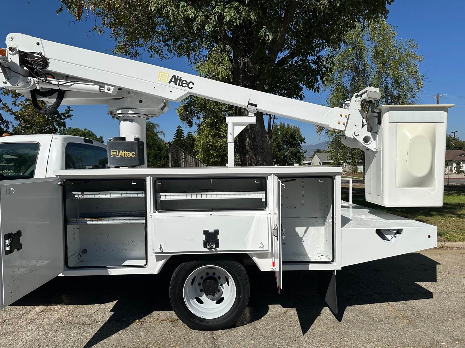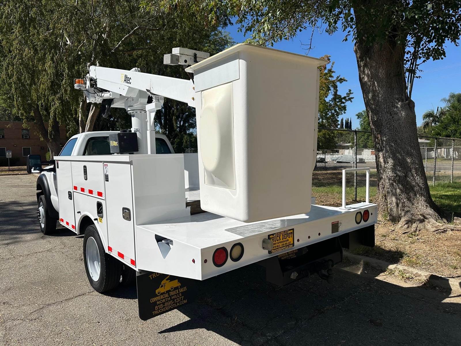 2015 Ford F-450 Bucket Truck, 6.8L V-10, auto trans, A/C, tilt, cruise, 138k miles, P.T.O. driven boom, strobe lights, Altec AT235 boom, 35' platform height, 42' working height, 350 lbs. capacity, Magnum Energy power inverter, 12' Altec steel service body, slide lock security bar, tow pkg, new tires, just serviced, runs & operates great. Nationwide shipping and financing are available.