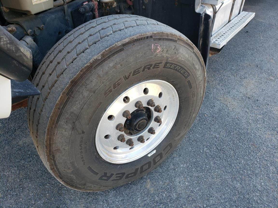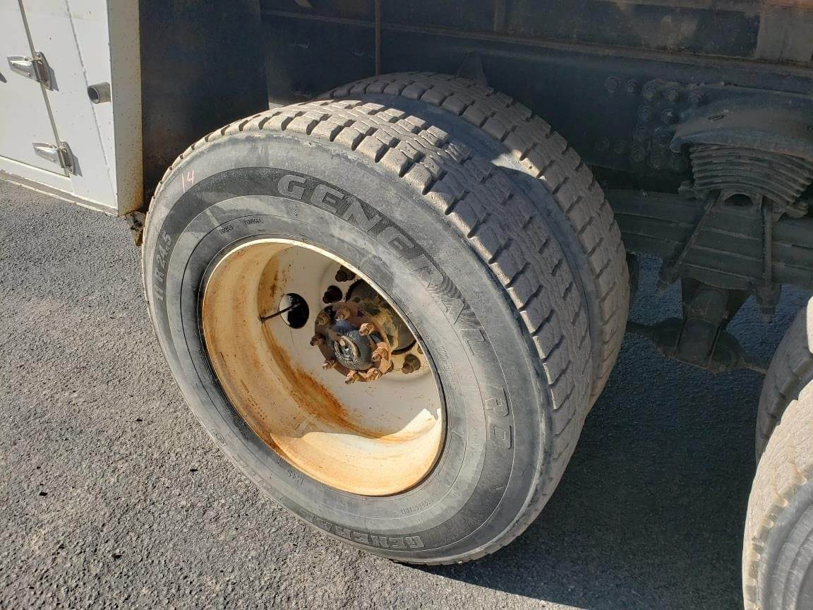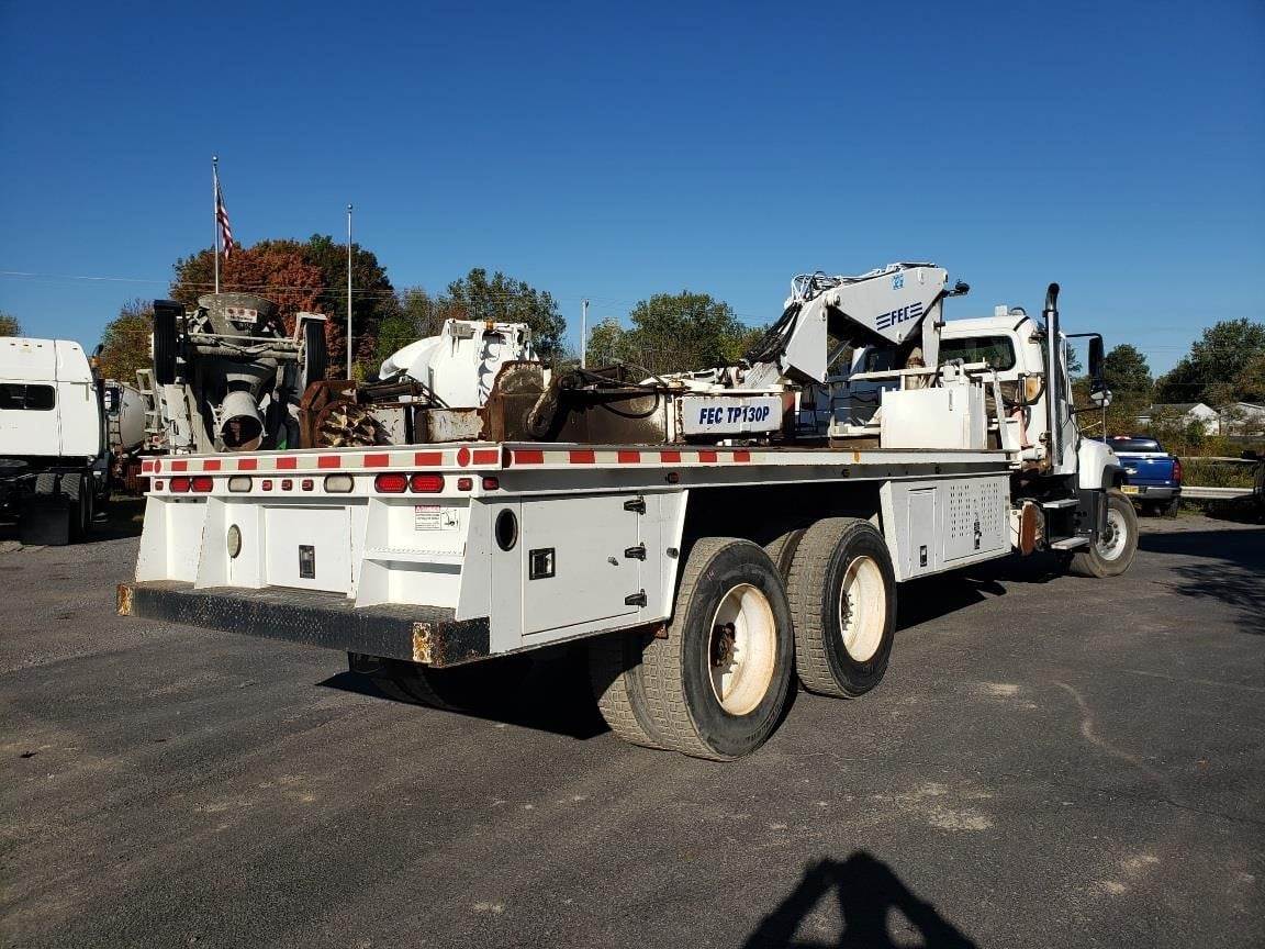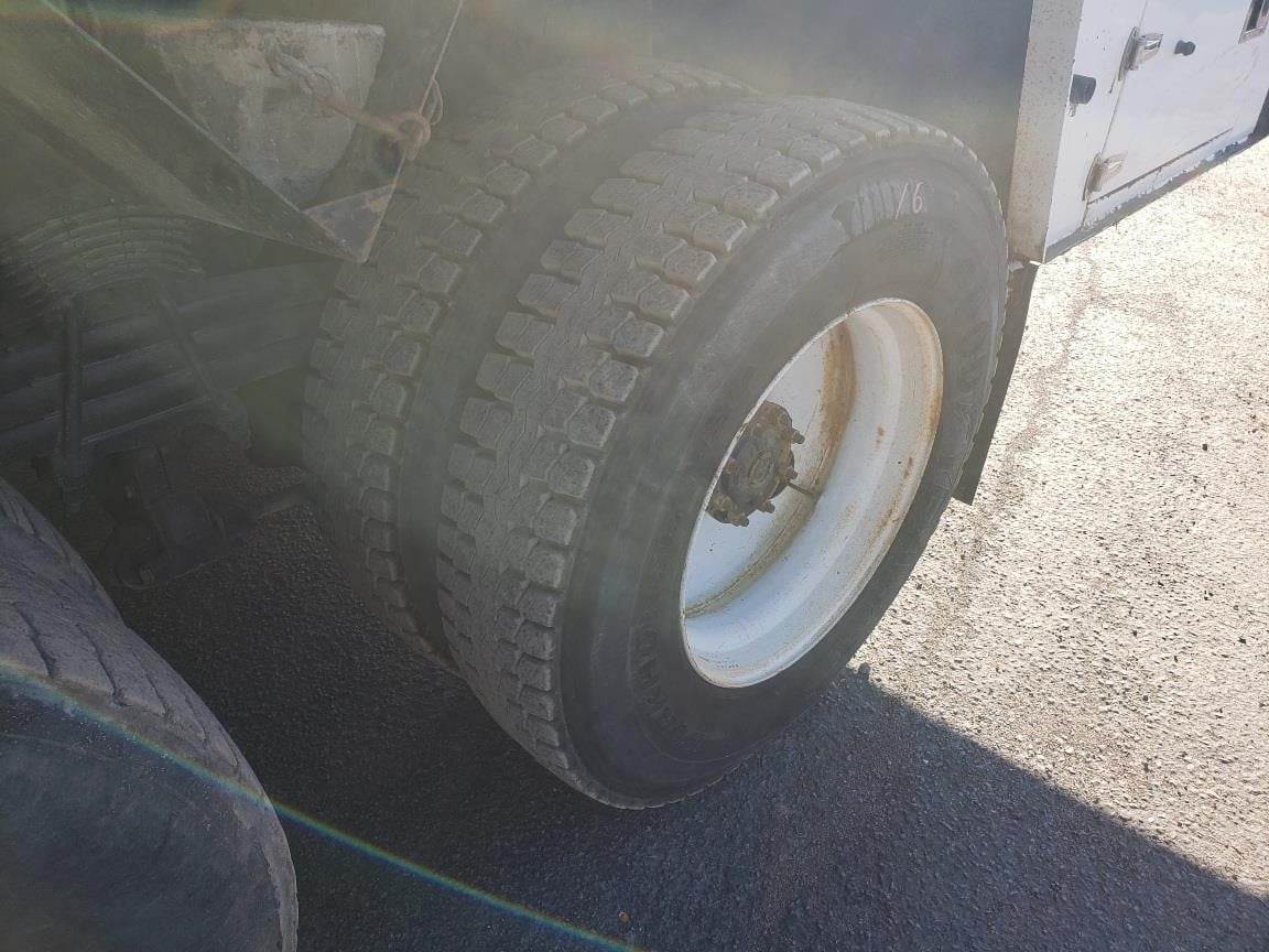 Clean, double frame tire grapple service truck for sale with FEC 3216 boom and FEC TP130P tire positioner, air compressor, 2 outriggers, and 20' x 102" bed, Cummins ISL engine with 380 HP, Eaton-Fuller 8LL transmission, 20K front axle and 44K full locking rears, TufTrac suspension, 425/65R22.5 front tires and 11R24.5 rear tires, 296" wheelbase, 208" C-T, 24'6" of frame behind the cab, and 4.63 ratio. 393,536 miles.