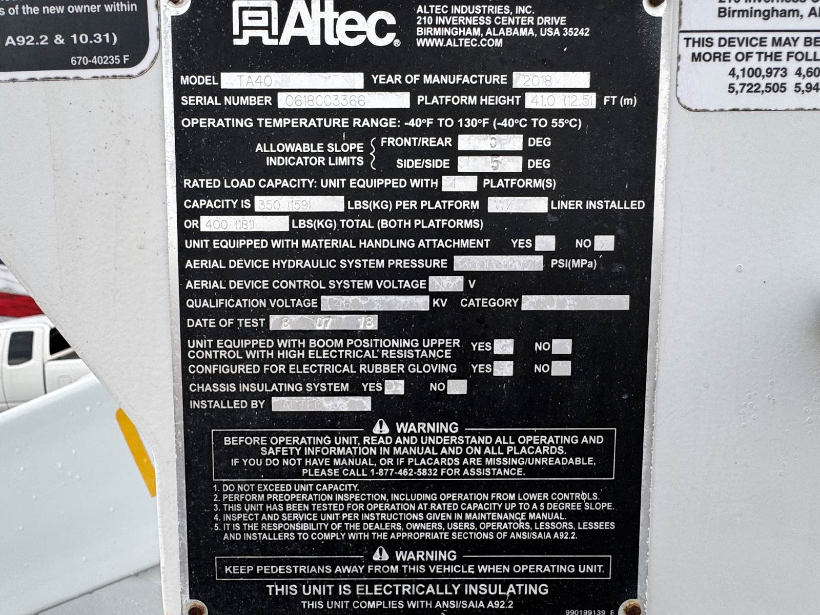 The Altec TA40 boom system is designed for productivity, offering a working height of 46 feet, a side reach of 29.5 feet, and a 41-foot height from ground to platform. With continuous rotation, hydraulic tool circuits at the boom tip, and a single-handle multi-function control system, the operator enjoys both precision and ease of use. The articulating and telescopic design features an insulating aerial device (Category “C”), end-mounted single-man platform with a 350-lb capacity, ensuring safety and versatility on the job site. Notably, the aerial operates without outriggers, enhancing mobility and efficiency when working in tight or urban spaces.