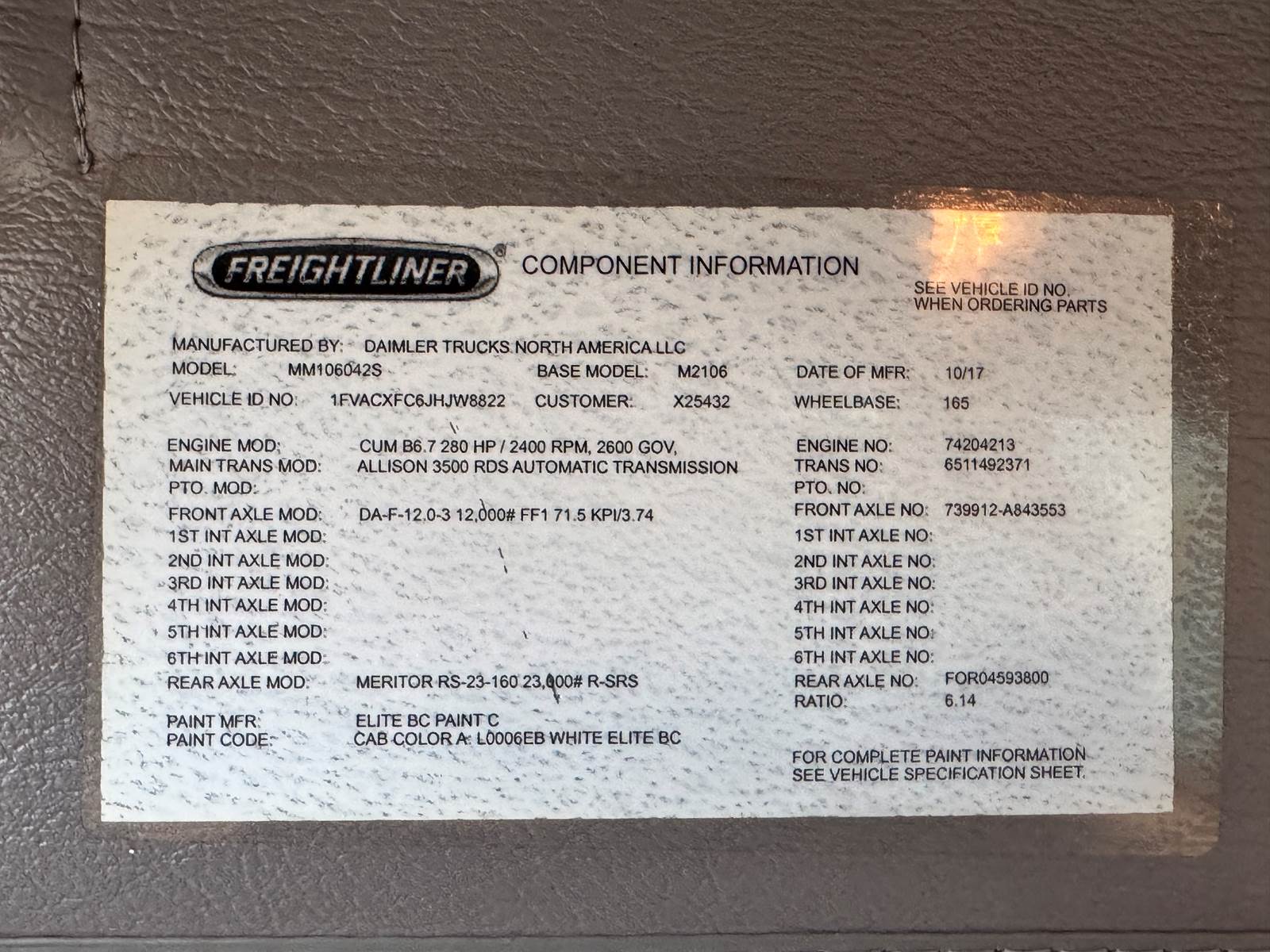 The 2018 Freightliner M2 106 equipped with an Altec TA40 articulating and telescopic boom is a dependable medium-duty bucket truck designed to deliver strength, reach, and efficiency. Powered by a 6.7L Cummins ISB engine producing 280 horsepower, paired with a 6-speed Allison 3500RDS automatic transmission, it provides both reliable performance and smooth operation. Built on a 33,000 lb. GVWR chassis with a 165-inch wheelbase, this unit is configured with a single front axle rated at 12,000 lbs. and dual rear axles rated at 21,000 lbs., supported by a spring suspension system for durability and stability under load.