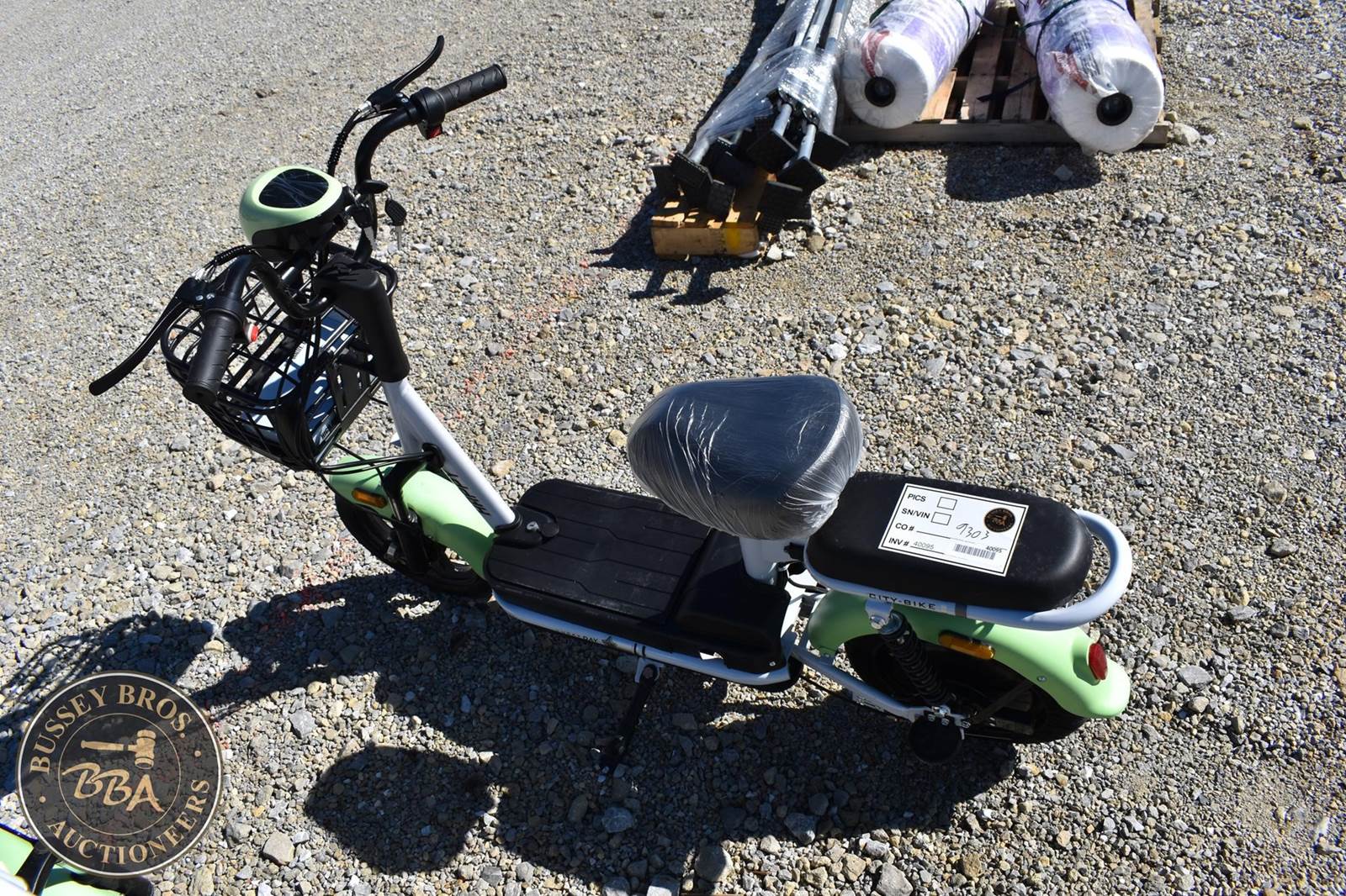 Future Electric Scooter, Green & Black, Serial 9303, features include a front basket, headlight, typical motor power 250W or 350W, lithium-ion battery, typical battery capacity 36V 10Ah, disc brake.