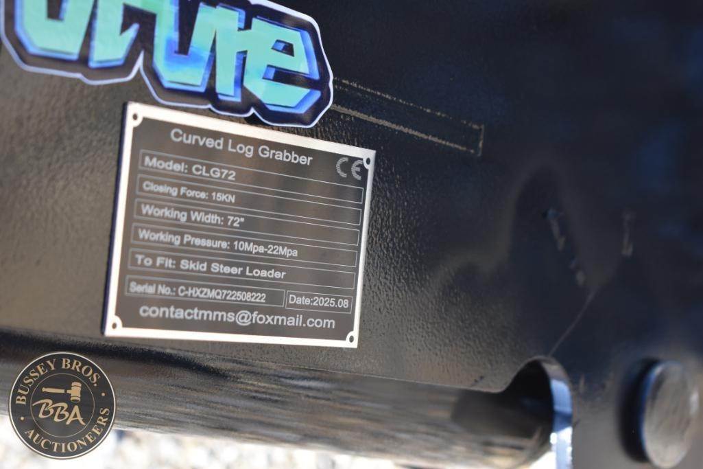 Future FT-CLG72 Skid Steer Log Grapple, 72-inch width, working pressure of 1450-3191 PSI, closing force of 1500N, steel construction, compatible with skid steer loaders, , Serial CHXM07225082022.