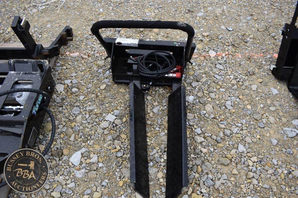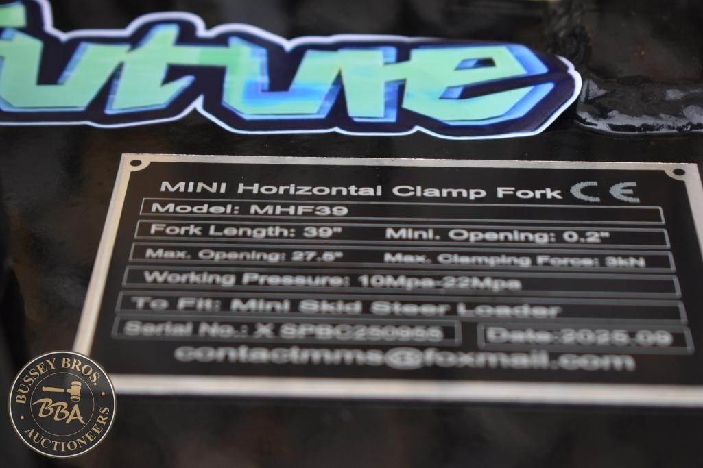 Future Mini Horizontal Clamp Fork MHF39, Fork Length: 39 inches, Minimum Opening: 0.2 inches, Maximum Opening: 27.6 inches, Working Pressure: 10 Mpa - 23 Mpa, Compatible with Mini Skid Steer Loader, Date of Manufacture: 2025.09, Serial Number: SPB026995.