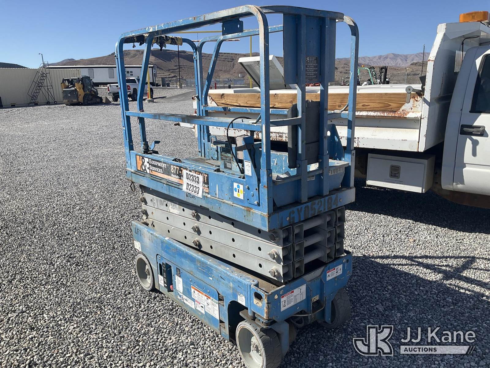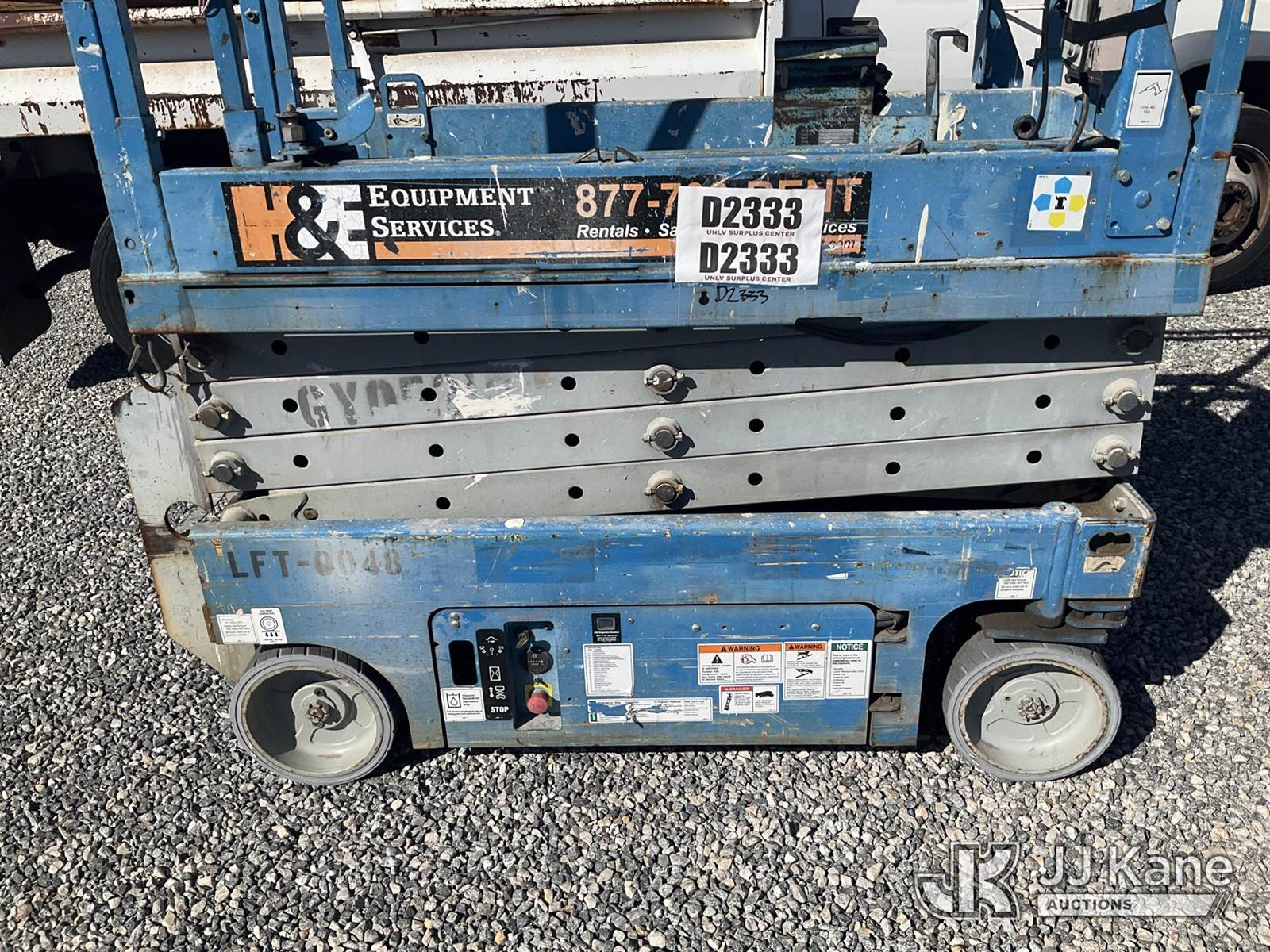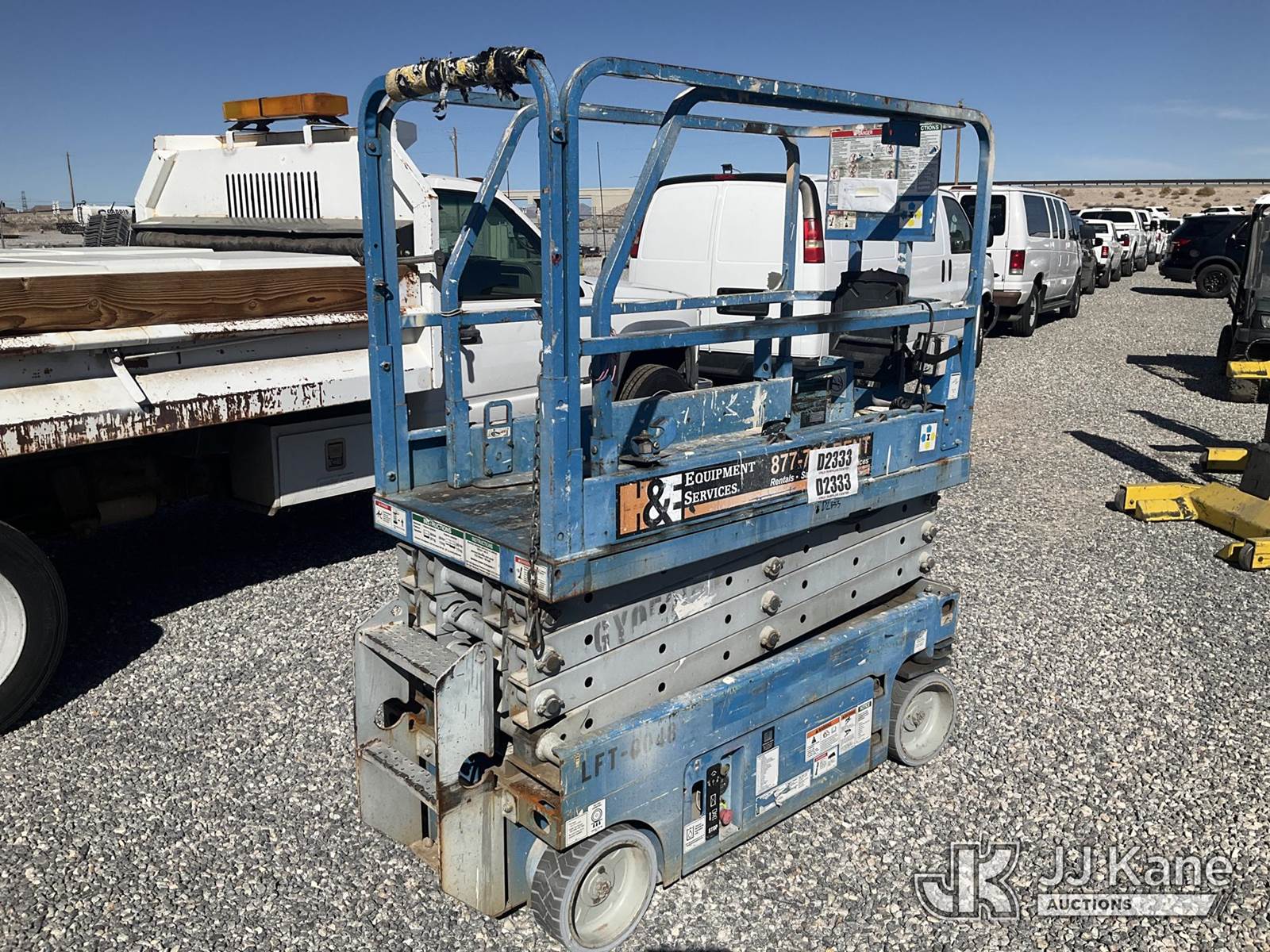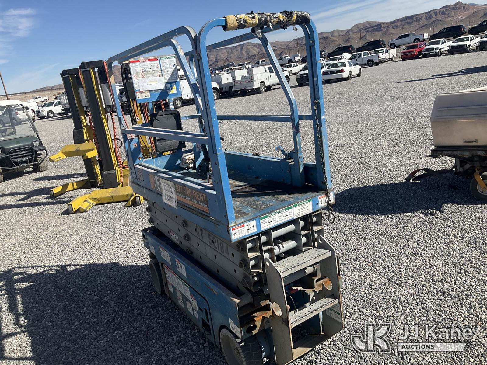 Genie Self-Propelled Scissor Lift, Hydrostatic, battery powered, (No Power, Condition Unknown) (Reads 384 hours) NOTE: This unit is being sold AS IS/WHERE IS via Timed Auction and is located in Las Vegas, NV. Inspection & preview days for this unit are the 2 business days prior to the first day of items closing for this auction, item is located at 14655 Grand Valley Pkwy Las Vegas, NV 89165 and hours of operations are 8a-4p. Titles executed exactly as bidder registered. Ensure your name and/or business name and address in JJ Kane and/or ProxiBid is correct before bidding. For pre-sale questions, please contact Office Staff @ (801) 519-0123 and provide sale date and lot number. Las Vegas Dealer License Number DLR000053086 / OHV000053094. (Buyer is responsible for removal. Assistance by consignor or JJ Kane Auctioneers is not assured.)